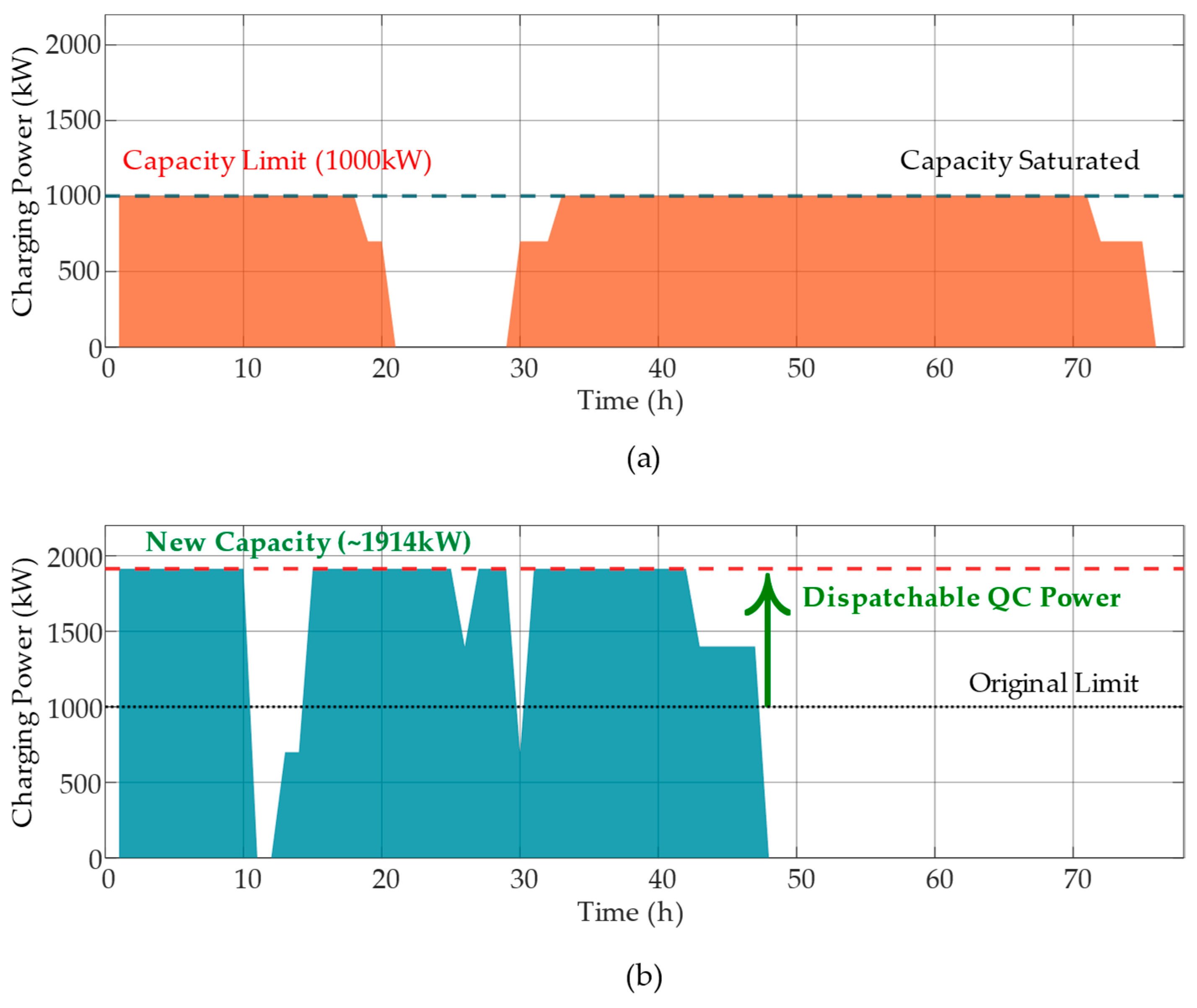 - Coordinated scheduling mode: This mode is based on the proposed ship–shore interconnection architecture. Through the, the 913.9 kW of dispatchable power () released from the QC side is integrated into the charging network, increasing the total available charging power to 1913.9 kW.