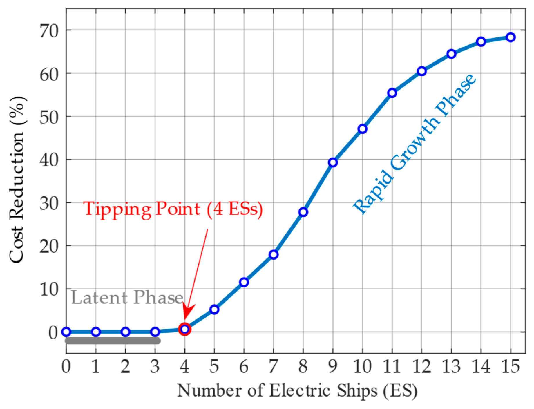 - The Latent Phase (0–3 ESs): When ES penetration remains below 20%, the cost reduction is negligible (approaching 0%). This observation suggests that at low electrification densities, the baseline transformer capacity (1000 kW) of the port is sufficient to accommodate charging demands, rendering coordinated scheduling unnecessary for capacity alleviation.