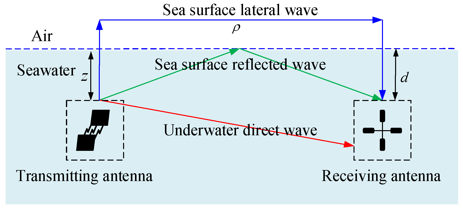 Figure 1 illustrates these distinct propagation paths, which include three primary components: the underwater direct wave, the sea surface lateral wave, and the sea surface reflected wave. The calculation of the EM field intensity and phase for each propagation path has been studied [
