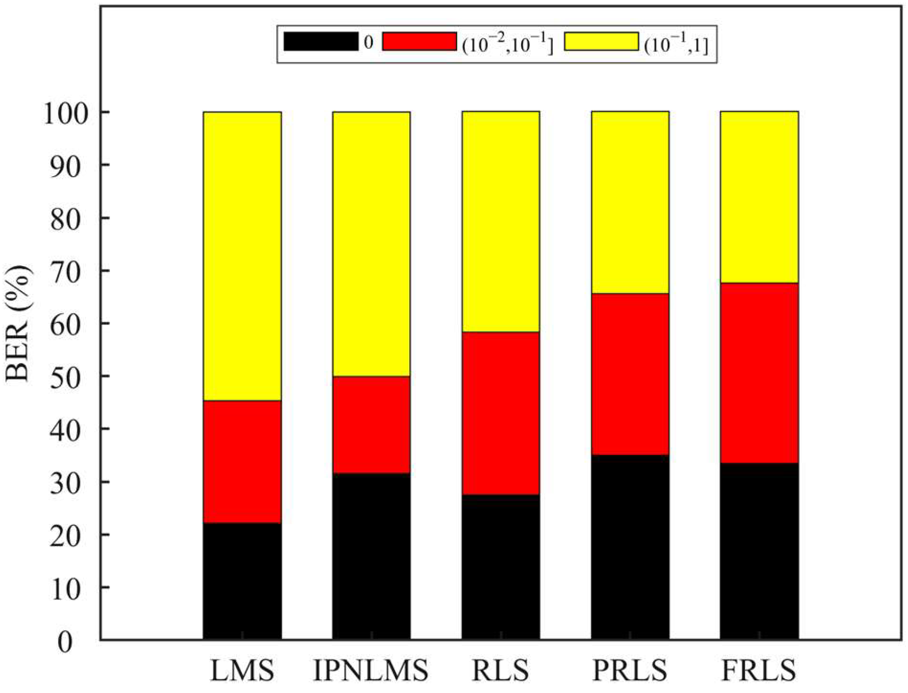 21], leading to constructive or destructive interference that causes fluctuations in the received signal strength. This phenomenon not only induces dynamic changes in the SNR but also potentially causes signal distortion, further exacerbating the instability of communication across seawater–air. The Recursive Least Squares (RLS) algorithm has attracted widespread attention due to its fast convergence rate, and norms have also been introduced into the RLS algorithm to further improve the algorithm accuracy in sparse environments [