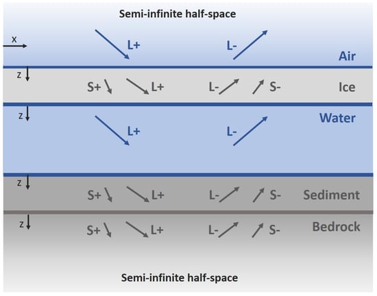 The five layers of the ICSW system are shown in Figure 1 as color blocks (blue for fluids, gray for solids), separated by four interfaces. The three blue lines correspond to fluid–solid interfaces, while the gray line denotes the solid–solid interface. The arrows indicate longitudinal and shear waves propagating upward (−) and downward (+).