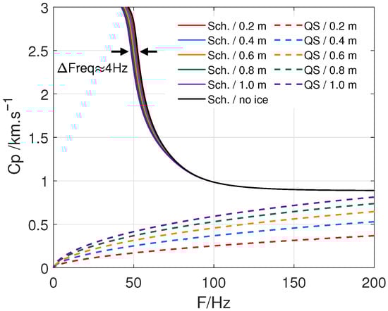 Taking hard sediment as an example, the effect of the presence and thickness of ice on the waveguide is first investigated. Dispersion curves for the QS and the SS waves are calculated for a range of ice thicknesses, with the depths of the water and sediment layers fixed at 6 m and 5 m, respectively. Since ice thickness in shallow water areas at high latitudes is generally less than 1 m, the ice thicknesses are varied between 0 m and 1 m. As shown in Figure 5, the QS wave (dashed lines) is highly sensitive to variations in ice thickness; its phase velocity increases significantly with thickness at any given frequency. In contrast, the SS wave (solid lines) is only slightly affected by ice thickness. When the ice thickness increases by a factor of 5, its dispersion curves exhibit only a minor downward shift along the frequency axis. For example, taking Cp = 2500 m/s as a reference point, the frequency corresponding to this velocity decreases from ∼52 Hz to ∼48 Hz. Once the frequency exceeds 80 Hz, all dispersion curves overlap almost perfectly.