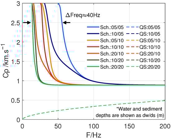Similarly, to study how water and sediment depths affect the dispersion characteristics, another set of dispersion curves is calculated with depths ranging from 5 m and 20 m, while the ice thickness is fixed at 0.35 m. As illustrated in Figure 6, the dispersion curves of the QS wave are represented by solid lines, while those of the SS wave are shown as dashed lines. The variations in color correspond to different water or sediment depths. The QS wave is completely unaffected by changes in water or sediment depth, with its dispersion curves perfectly overlapping. By contrast, the SS wave is highly sensitive, with dispersion curves strongly altered by changes in depth. For example, at Cp = 2500 m/s, the corresponding frequency change in the SS wave is less than 8% when the ice thickness increases by a range of [0 m, 1 m], as shown in Figure 5; and such a change exceeds 75% at most when the sediment depth changes by a factor of four (5 m to 20 m) in Figure 6.
