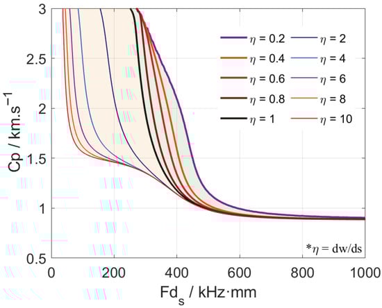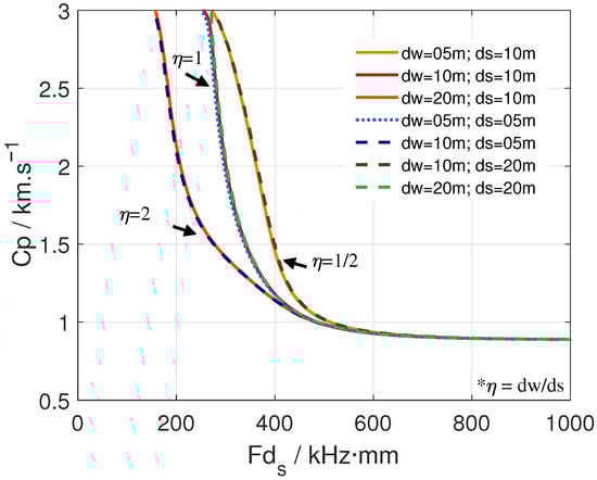 In general, the dispersion curves of SS waves maintain a similar shape, and increasing either water or sediment depth shifts the dispersion curve downward; sediment depth has the greater influence. For instance, comparing the two dispersion curves with the same total depth of 15 m (purple and light orange lines), at Cp = 2500 m/s, a larger sediment depth corresponds to a lower frequency. The same trend is seen in the two curves with a total depth of 30 m (green and maroon lines in Figure 6). Since the SS wave dispersion curve resembles the letter ‘L’ in the F-Cp space, and the Cp converges with increasing frequency (Figure 6) regardless of water or sediment depth, the frequency at which Cp converges can be taken as a reference point for quantitative comparison. This convergent frequency () is defined as the frequency where the difference between Cp and its stabilized value (884.96 m/s) is sufficiently small, e.g., less than 10 m/s. The values of are extracted from Figure 6 and are listed in Table 1, demonstrating a clear linear proportionality between and sediment depth. However, when considering frequencies at which Cp reaches 2500 m/s (Table 2), this proportionality no longer holds, as Cp deviates from its convergent value. To systematically analyze the geometric effects of the waveguide structure, we introduce a dimensionless parameter , defined as the ratio of water to sediment depth. As shown in Figure 6, dispersion curves with the same exhibit similar topological shapes but are shifted along the frequency axis, indicating a geometric similarity law where the mode characteristics are preserved under proportional scaling.