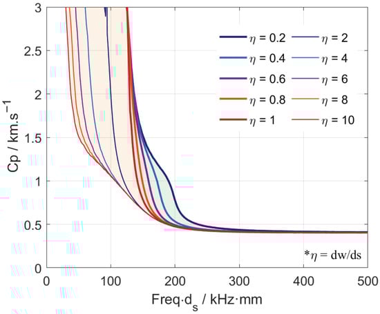 For the case of soft sediment layers, the same trend is observed. The dispersion curves with the same ratio of water depth to sediment depth () still exhibit similar shapes (Figure 9). However, as the sediment layer softens, the density and wave velocities decrease, and the frequency interval between the dispersion curves corresponding to the same ratio narrows significantly (e.g., from to ). As shown in Figure 10, when values ranging from 0.2 to 10, two distinct patterns emerge. For , the dispersion curves converge at around 2000 m/s and the low-velocity end, though convergence is much slower at the low-velocity end. For , in the same manner as for the case of hard sediment layers, the dispersion curves diverge at high velocity ( m/s approximately), shifting leftward with increasing , but they converge quickly once the phase velocity falls below 1200 m/s. Nevertheless, regardless of how large becomes, the phase velocity ultimately converges with increasing , and stabilizes at approximately 900 m/s.