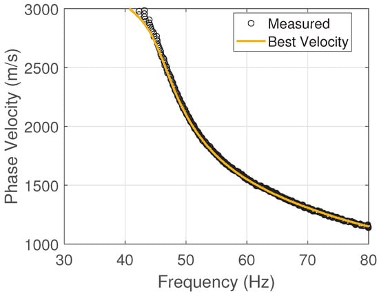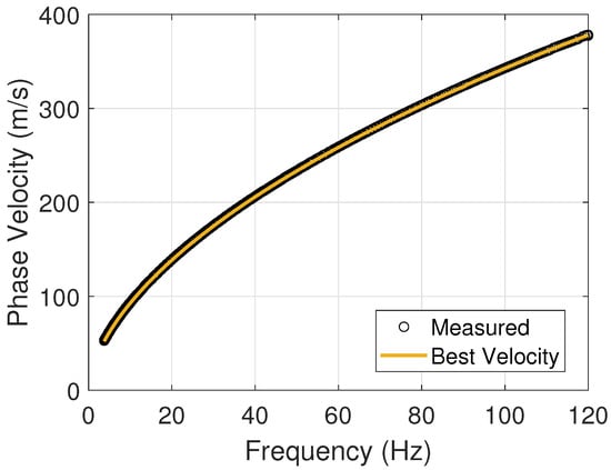 Following the procedure, the ice thickness is estimated first. Since the QS wave has no cutoff frequency and is dispersive across the frequency band, its dispersion curve was modeled over the range of [4 Hz, 120 Hz] with a resolution of 0.01 Hz. Based on prior knowledge, the search grid for ice thickness was set between 0.3 m and 0.5 m with a resolution of 0.01 m. Once the QS dispersion curves for all search nodes are obtained, they are interpolated so that the modeled phase velocities are available at the same frequencies as the simulated data. The RMSE between the simulated and modeled Cp was calculated and is shown as blue bars in Figure 13, with the minimum RMSE (yellow bar) of 0.56 m/s corresponding to an estimated ice thickness of 0.35 m. The estimation of ice thickness is consistent with the setting of simulation, and the best-fitting QS wave dispersion curve is illustrated alongside the simulated data (black circles) in Figure 14.