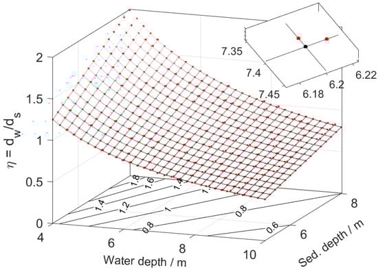For the joint inversion of water and sediment depths, a 2D search grid for () was constructed with a uniform resolution of 0.2 m. The search ranges for water and sediment depths were [5 m, 8 m] and [4 m, 10 m], respectively, resulting in 496 mesh nodes in total. The of this grid ranges between 0.5 and 2, which yields 151 unique values once the numerical precision is limited to 1%. The exact at each node was then rounded to this precision. If the rounding changes the value of a node, the original node (black dot) is then replaced by two nearby nodes (red dots) whose matches the rounded value. For example, a node with of 0.837838 is replaced by two nearby nodes with a rounded of 0.84 (inset of Figure 15). In this way, the search grid is re-meshed with more nodes (increasing from 496 to 920 in Figure 15), while the number of unique values is greatly reduced (e.g., dropping from 453 to 126). Consequently, the number of SS wave dispersion curves required for the joint inversion is substantially reduced.