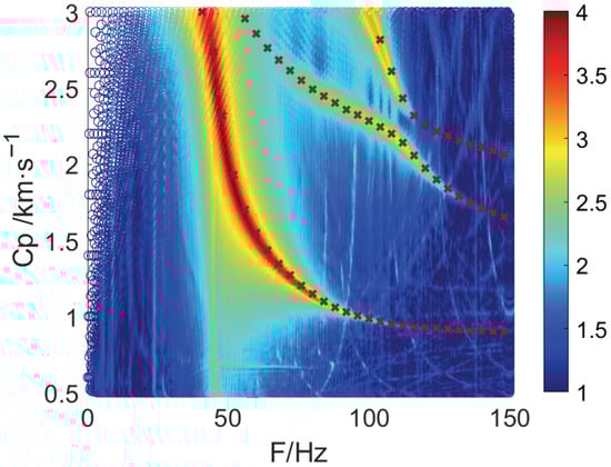 F-K analysis of the vertical signals recorded by Array #1 was performed via 2D Fourier transform and projected into F-Cp space (Figure 4). The QS and SS waves are the dominant modes energetically, both dispersive at low frequencies, with higher-order modes also present. The dispersion curves from the analytical model (red ×) are superimposed on the simulation results, showing excellent agreement across all four modes. It is worth noting that the distinct vertical energy strip observed at approximately 50 Hz is attributed to the spectral characteristics of the source excitation (50 Hz Ricker wavelet) and does not represent a dispersive mode of the waveguide.