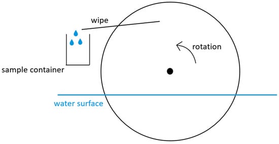 In the development phase of the SML sampler, glass discs were preferred to a drum configuration based on their operational and practical advantages. Due to the USV’s movement, employing glass discs significantly minimizes SML disturbance in comparison to drums—for which the surface in contact with the sea surface is larger [24]. Their lower weight is also favorable, considering the payload limitations of the research vessel. Moreover, glass discs can be readily manufactured locally, whereas the procurement of a glass drum requires a specialized order, typically delivered within considerable time scales. An initial prototype was therefore developed in the lab, consisting of glass discs vertically immersed in water.