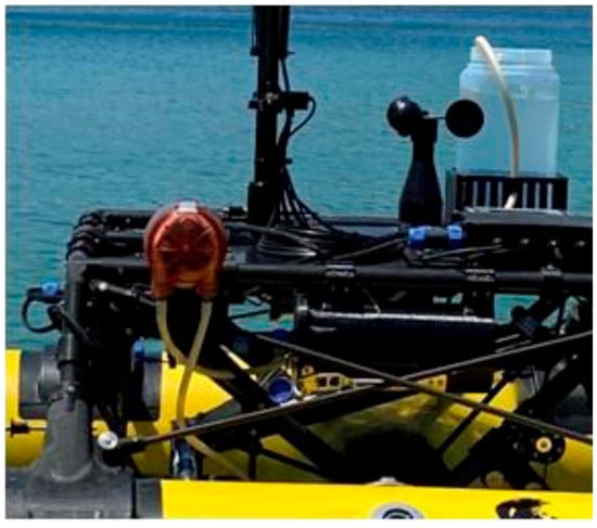 The SML and SSW samplers were both installed on a catamaran-type USV (Figure 6), consisting of floating and ground parts. Regarding the floating part, the vessel, which consists of two inflatable floats made of Hypalon neoprene, is 170 cm long, with a width of 60 cm, a deck surface area of 50 cm × 40 cm and a payload of approximately 15 kg. Its mechanical parts also comprise the frame from carbon fibers, four (4) lateral motors, two rechargeable lithium-ion batteries (18 Ah/14.8 V) installed outboard and abreast of the vessel (Figure S2) and basic electronic navigation and control systems. The maximum energy autonomy of the system is 3.5 h. GPS (RKT GNSS; GLONASS, Galileo, BeiDou, QZSS) and Telemetry subsystems are responsible for USV navigation, the range of which was tested up to 5.5 km. An autopilot compatible with Pixhawk 4 is used. The vessel also includes 3 gyroscopes, 3 accelerometers and 3 magnetometers. The vessel was equipped, specifically for SML sampling, with sensors for wind speed and solar irradiation measurements (Figure S3).