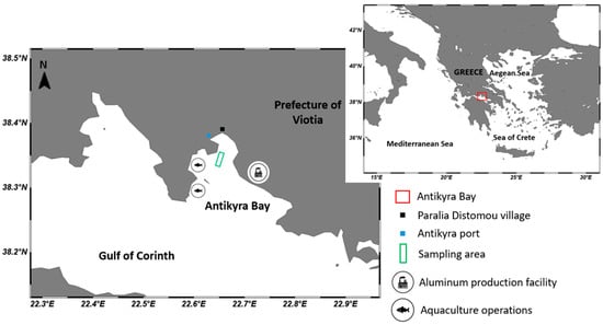 A complete sampling campaign was performed on two consecutive days (25–26 June 2024) at Antikyra bay, a semi-enclosed coastal system located along the northern coastline of the Gulf of Corinth, in Viotia, Central Greece (38.37° N, 22.64° E) (Figure 7). The bay is surrounded by large mountains blocking the north wind, so calm conditions frequently prevail on the sea surface. The surrounding area is impacted by a large-scale aluminum production unit, agricultural runoff, urban effluents and extensive aquaculture facilities.