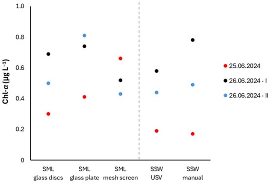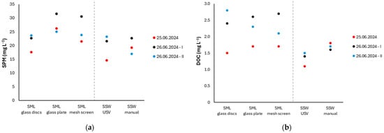 The SPM, DOC and Chl-α concentrations are presented in Figure 8 and Figure 9. Due to the general enrichment of the SML, relative to SSW, the corresponding enrichment factors (EFs) are also reported (Table S3), defined as the ratios of SML to corresponding SSW concentrations (EF = CSML/CSSW) [4,37]. SML samples were collected using (i) the rotating glass discs of InterSeA USV (SML glass discs), (ii) a Harvey-and-Burzell-type glass plate (SML glass plate) and (iii) a Garrett-type mesh screen (SML mesh screen). SSW was sampled: (i) autonomously, using the peristaltic pump installed on the InterSeA USV (SSW USV); (ii) manually, immersing the sample container to a depth of approximately 20 cm (SSW manual).
