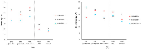 The sum of the concentrations of the 16 US EPA priority dissolved PAHs indicates that the three SML sampling techniques applied yielded similar concentration ranges (p = 0.62; one-way ANOVA) (Figure 10a, Table S4).