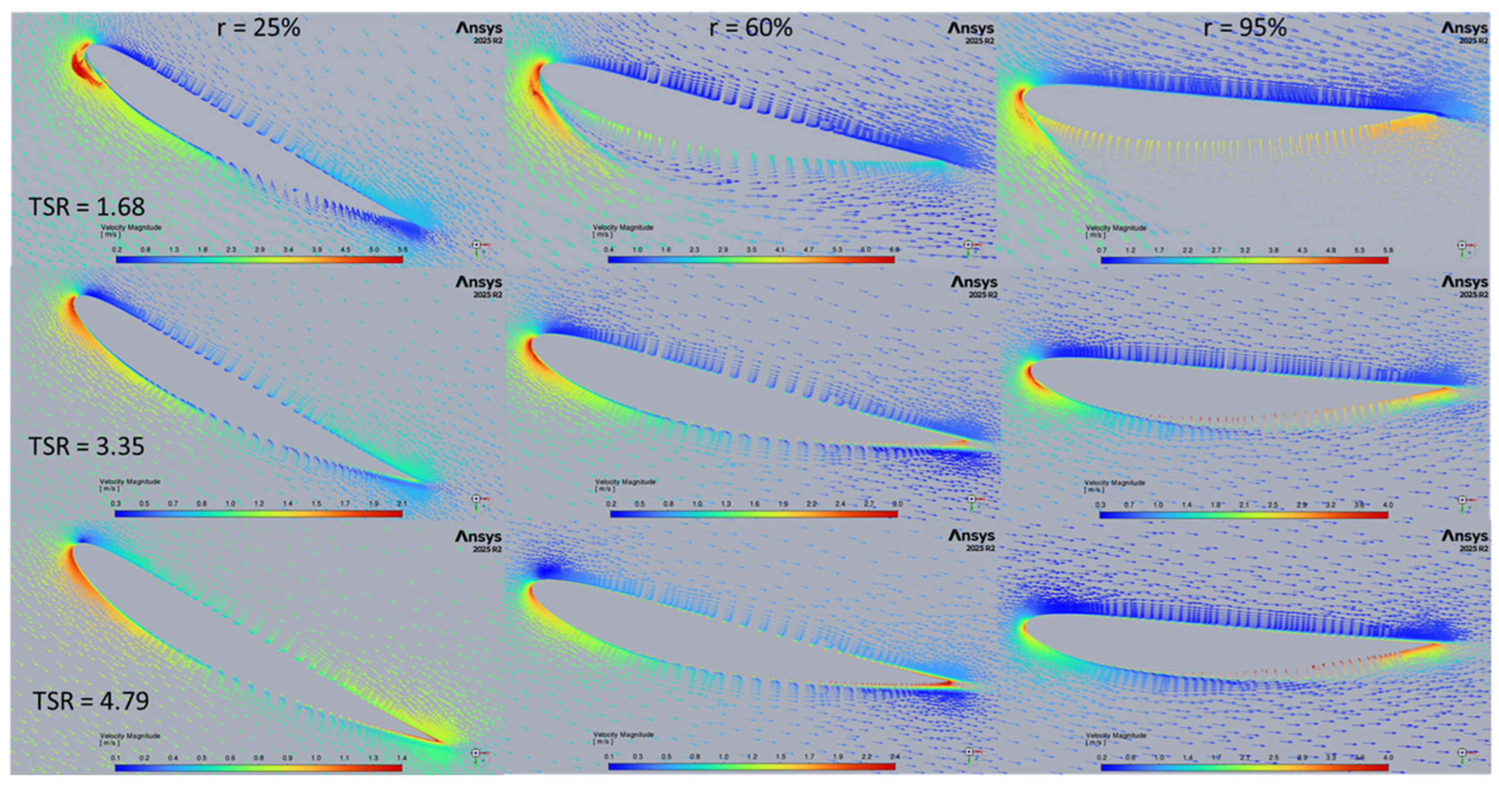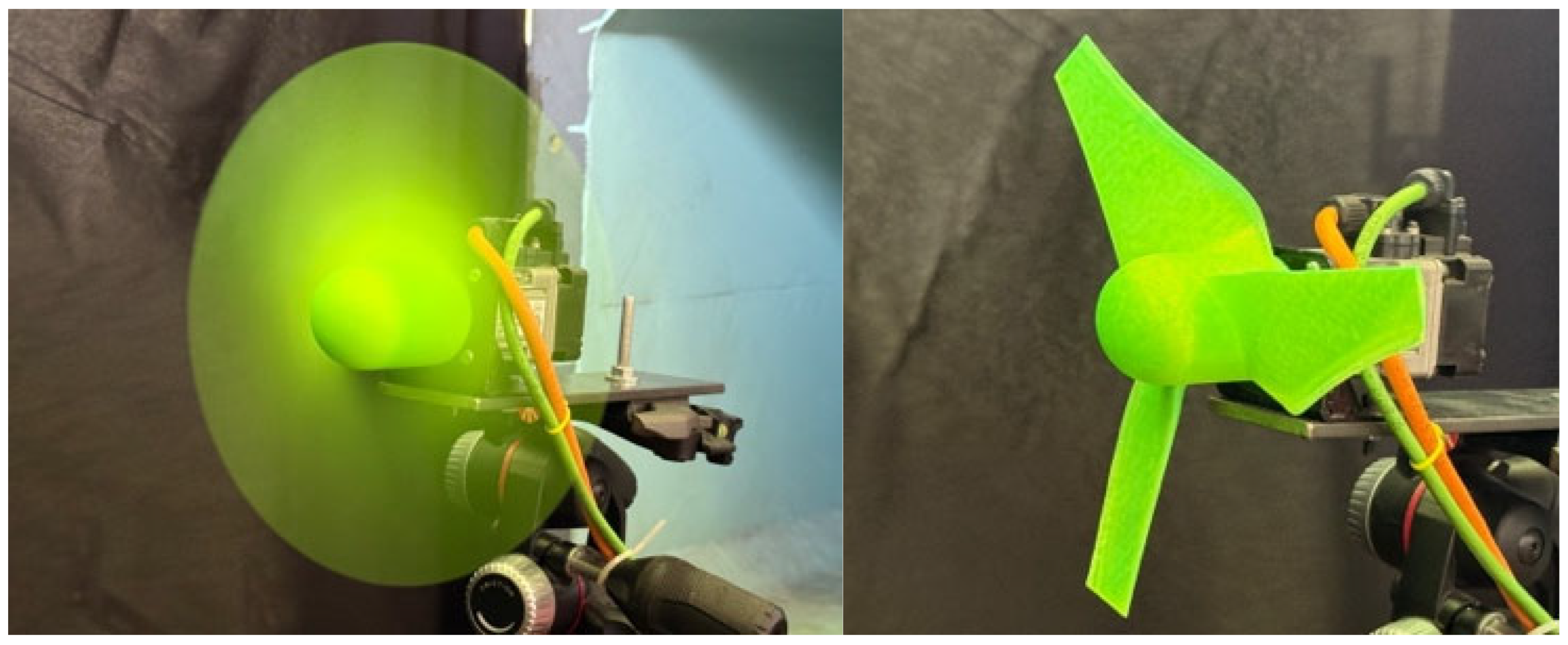 - Performance calculation: Based on the measured values of air velocity, turbine rotational speed, and torque, the power output as a function of air velocity was calculated. The turbine power coefficient and torque coefficient were then evaluated as functions of the TSR.