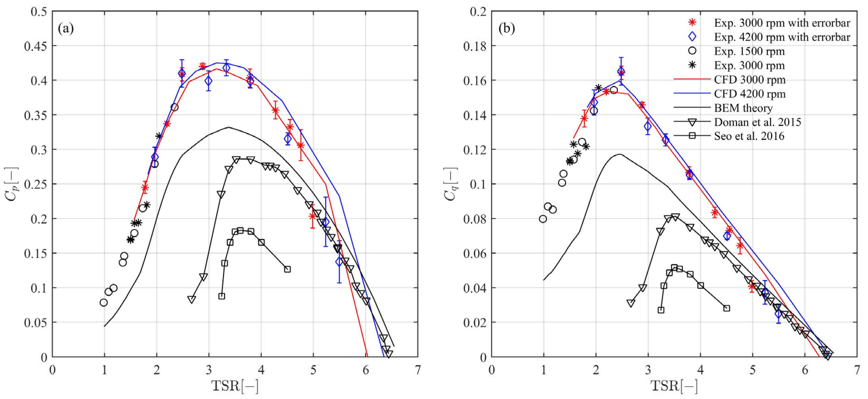 - The BEM results show lower power and torque coefficients than the experimental and CFD results, primarily due to centrifugal pumping. However, there is agreement on the TSR value at which the maximum coefficient values are attained.