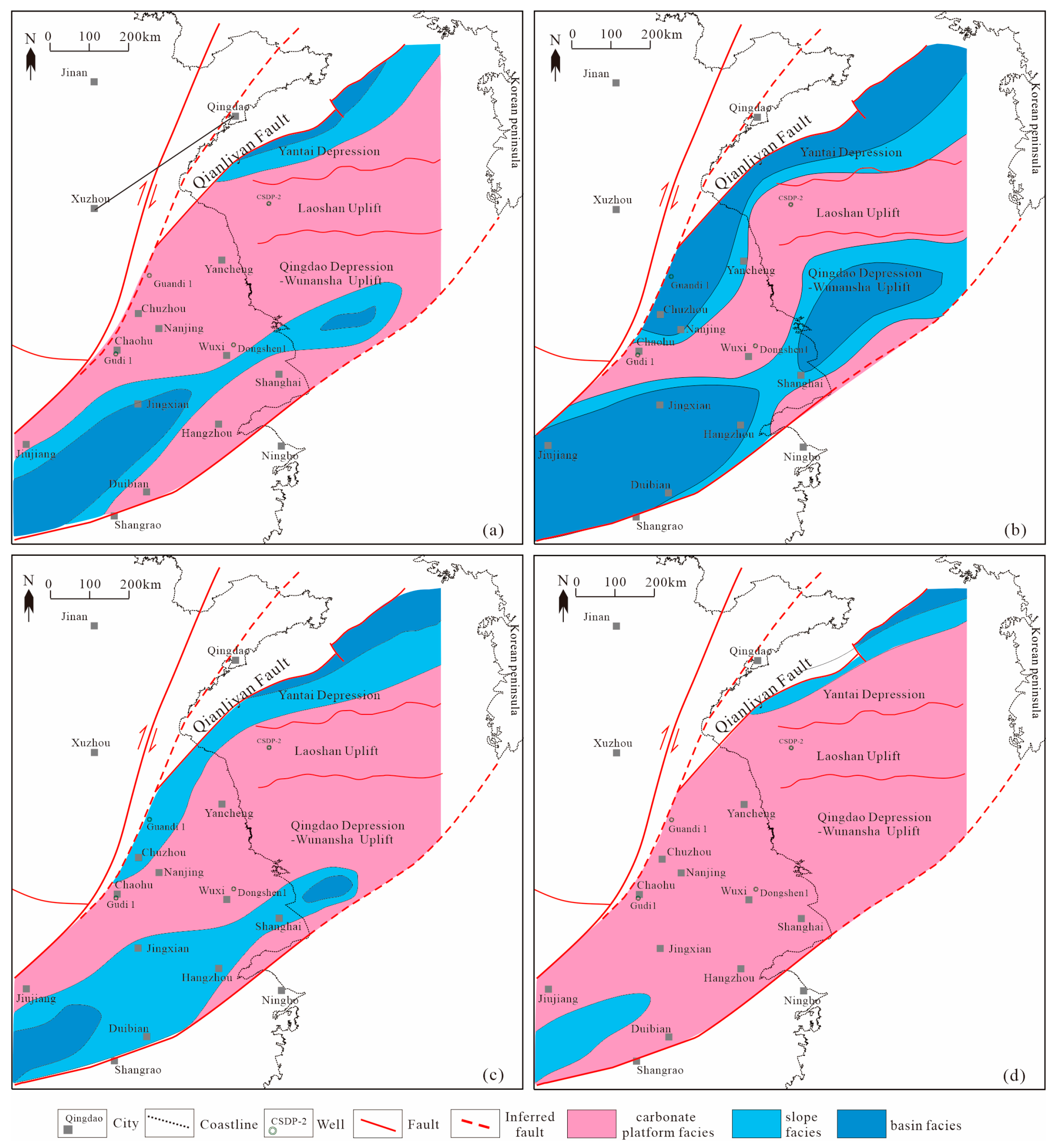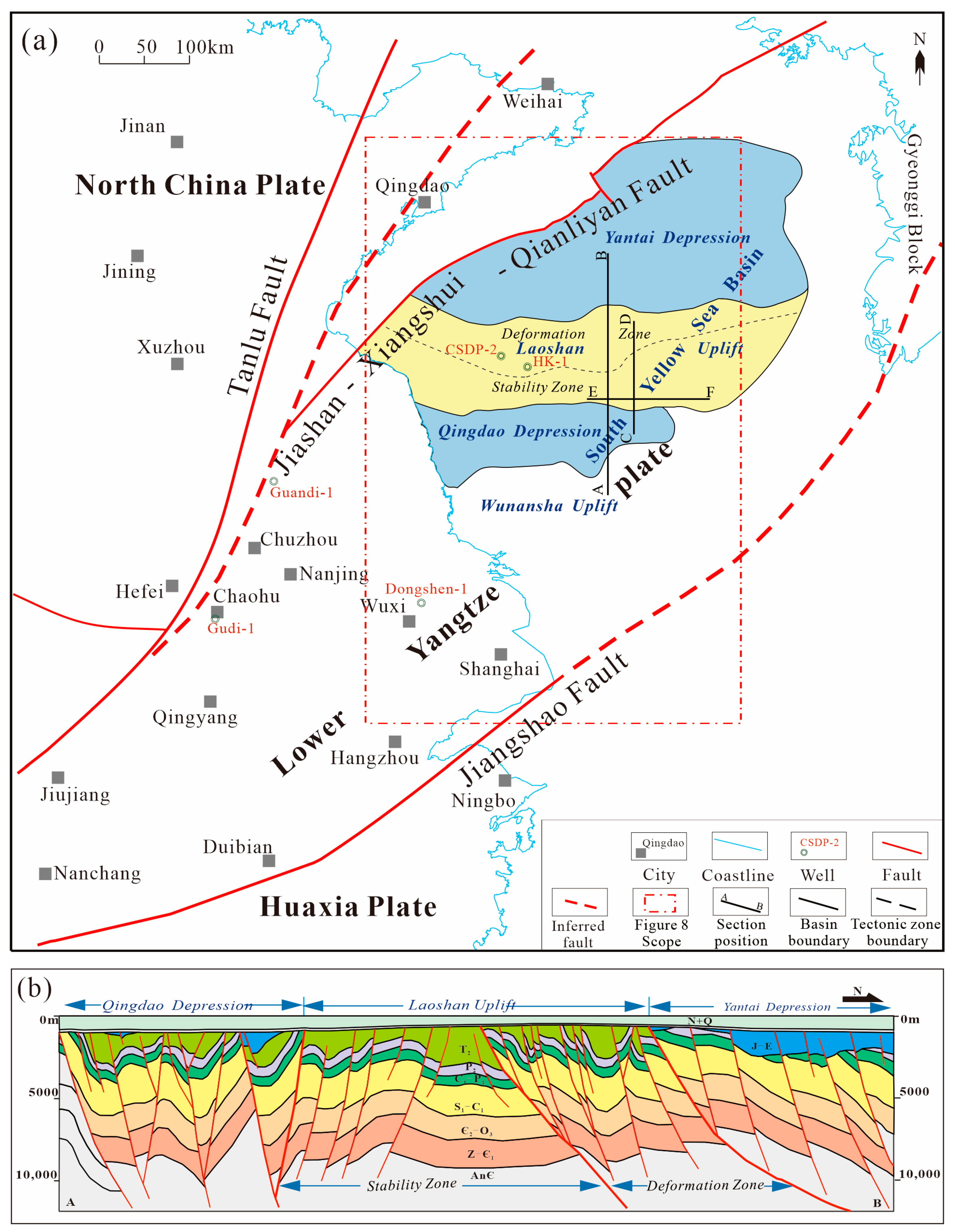 - Yao, Y.J.; Xia, B.; Feng, Z.Q.; Wang, L.L.; Xu, X. Tectonic evolution of the South Yellow Sea since the Paleozoic. Pet. Geol. Exp. 2005, 27, 124–128. [Google Scholar] [CrossRef]