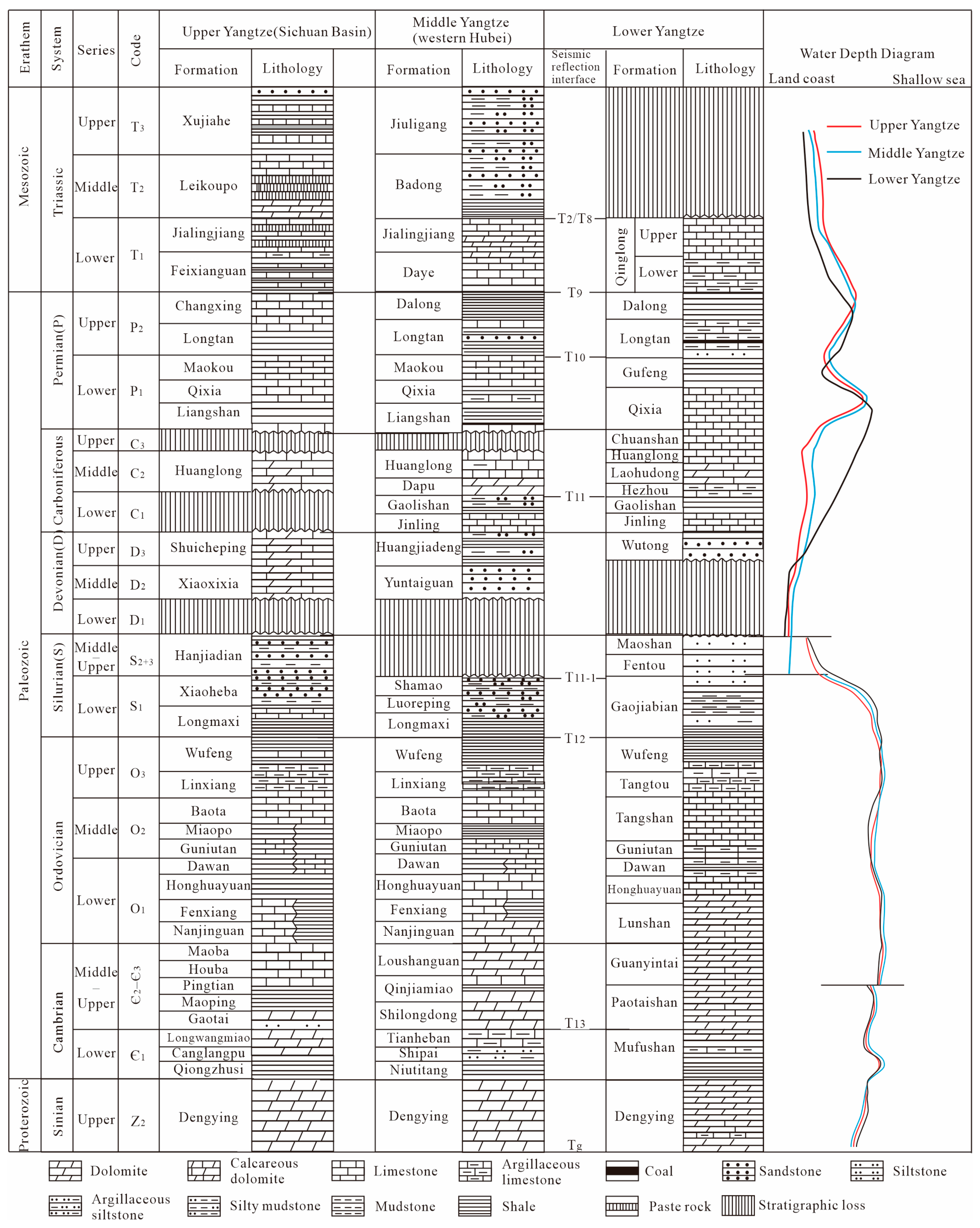 - Cai, F.; Xiong, B.H. Marine Mesozoic-Paleozoic stratigraphic correlation and evaluation of hydrocarbon source rocks in the South Yellow Sea and the Lower Yangtze. Mar. Geol. Front. 2007, 23, 1–6. [Google Scholar]
