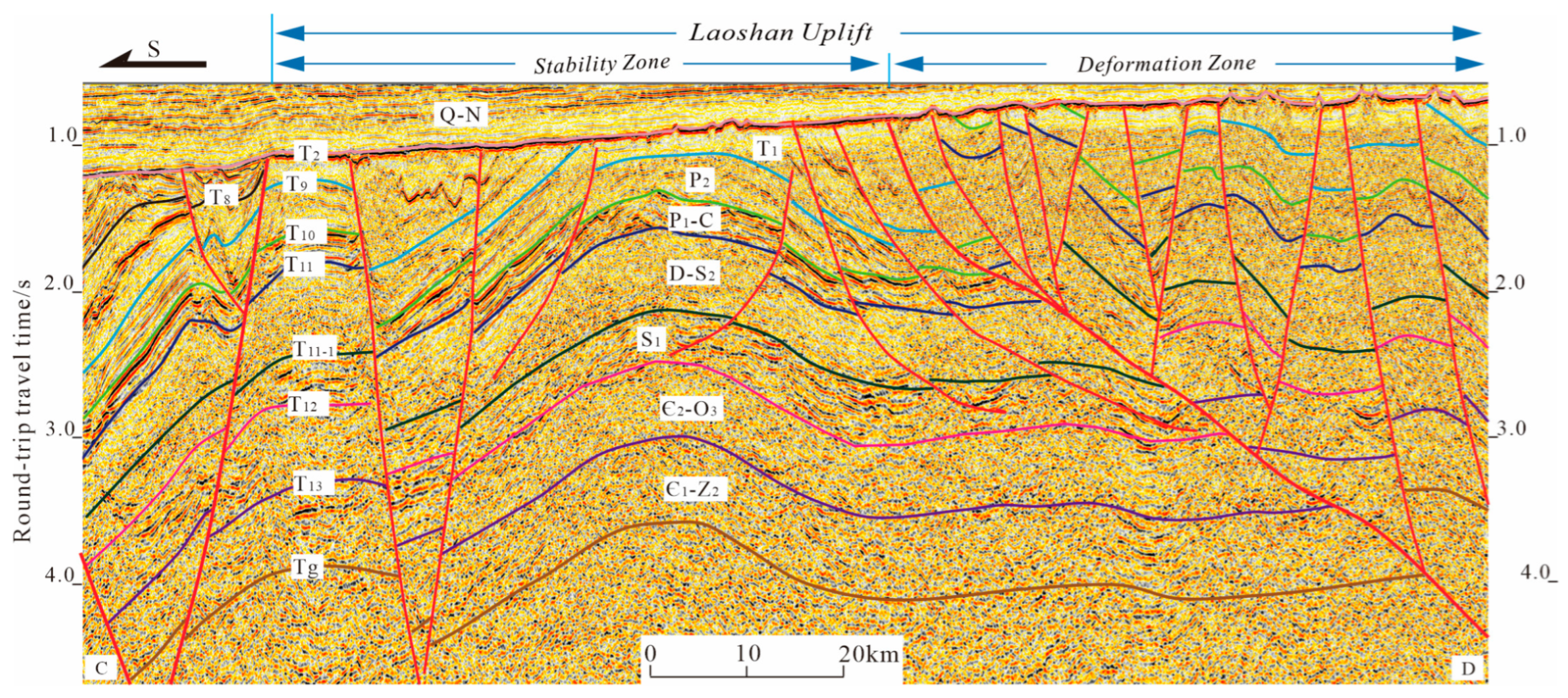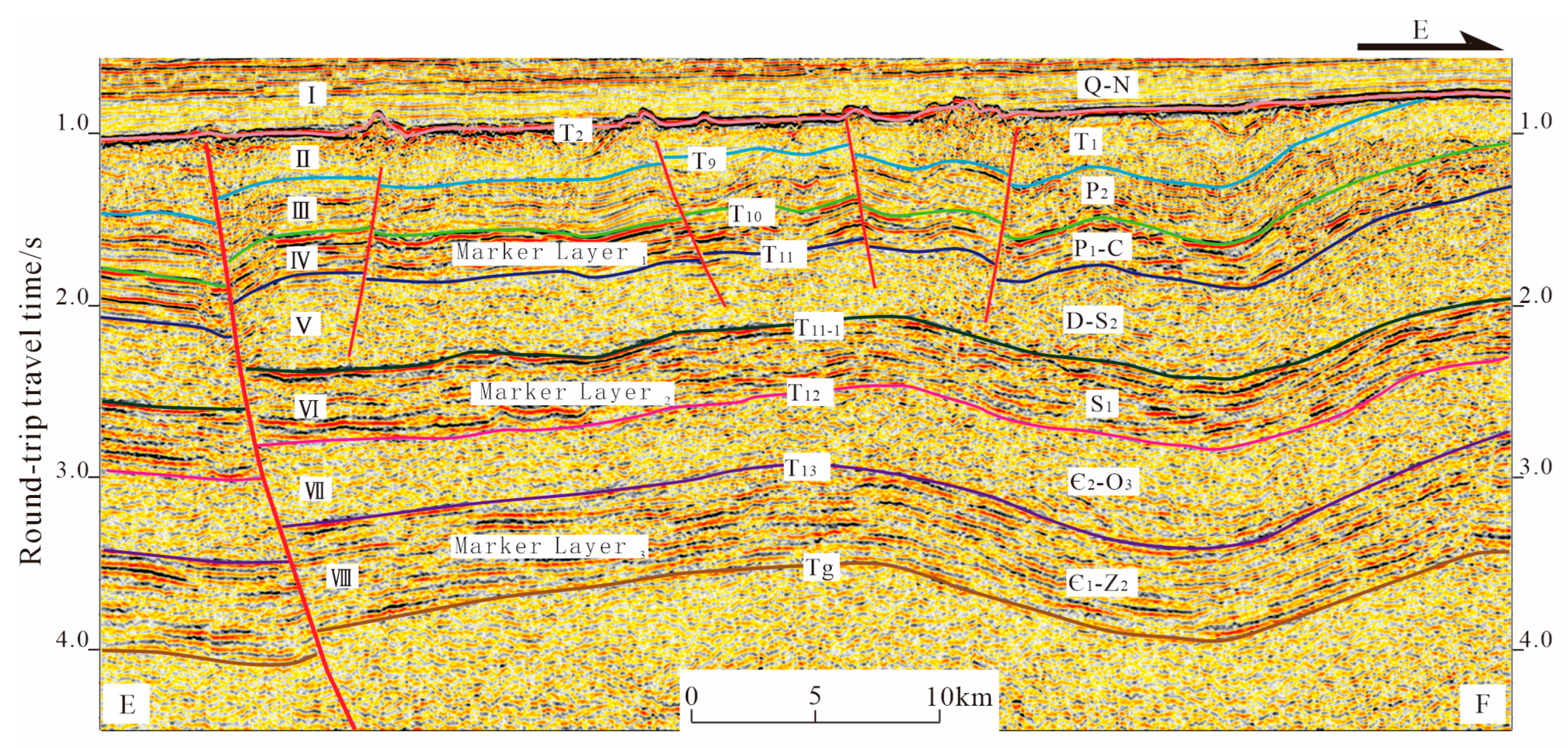 4.1. Seismic Sequence Division and Geological Structural Characteristics