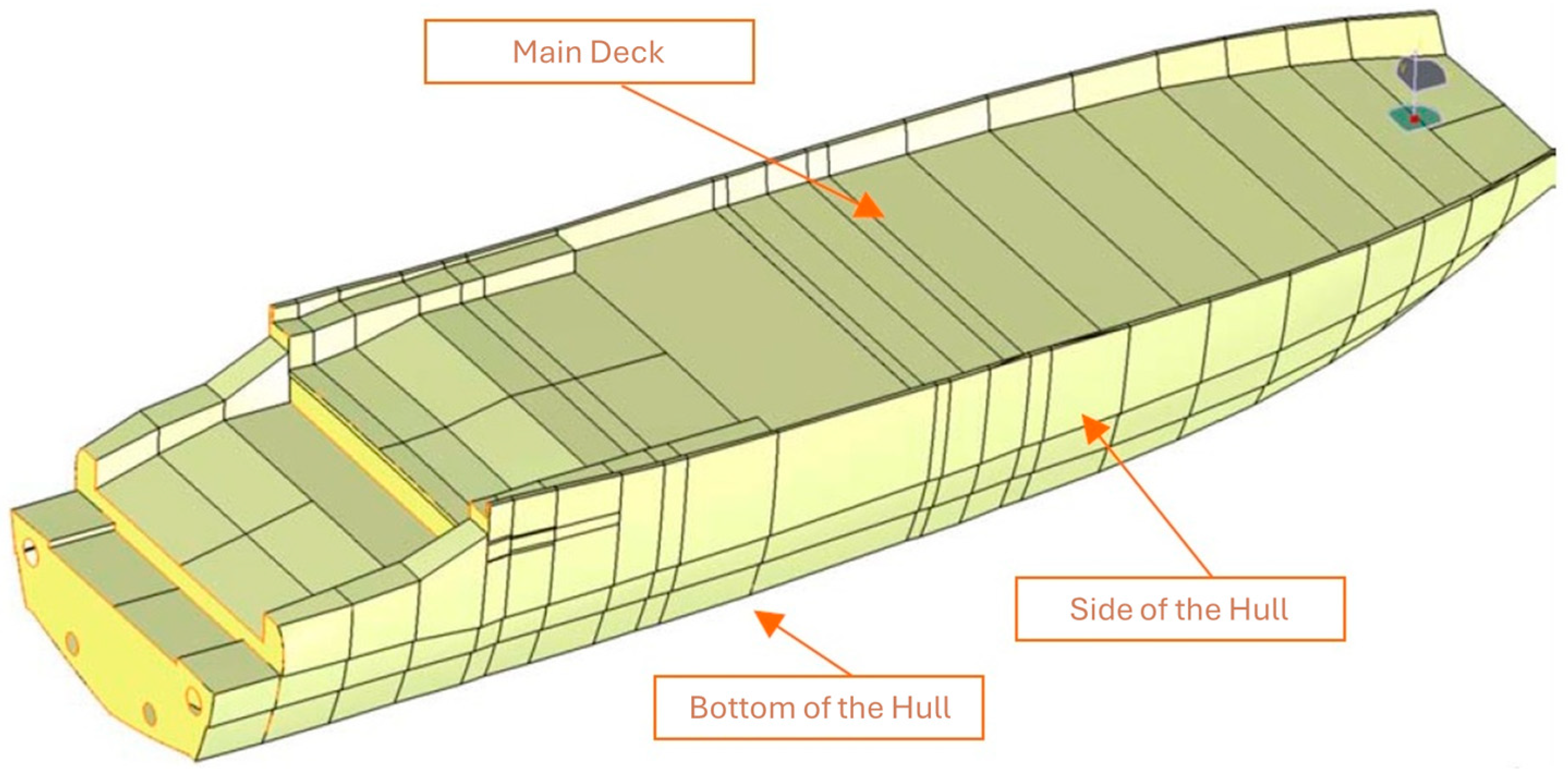 (a) Shell elements of the hull bottom and keel. (b) Shell elements of the deck and hull sides. (c) Shell elements of the bulkheads and transverse frames. (d) Shell elements of the longitudinal reinforcements. All the units are in [mm].
