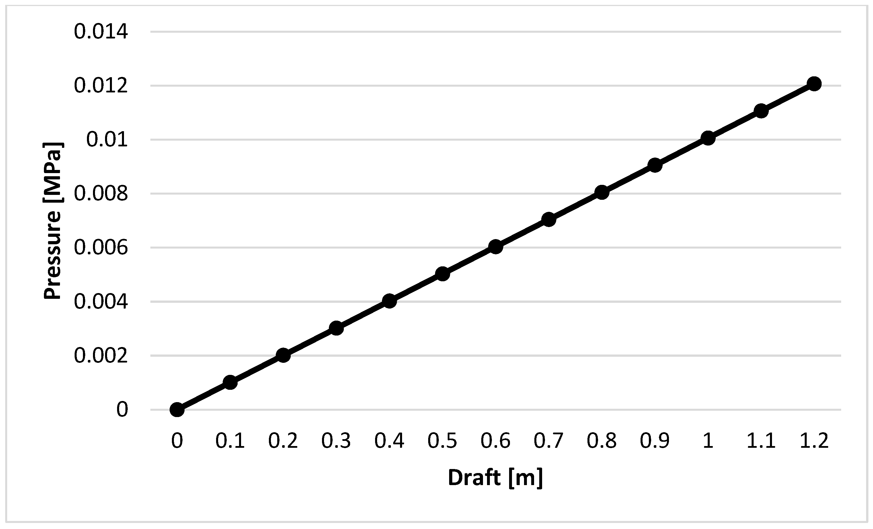 Hydrostatic pressure distribution versus hull depth (draft = 1.21 m).