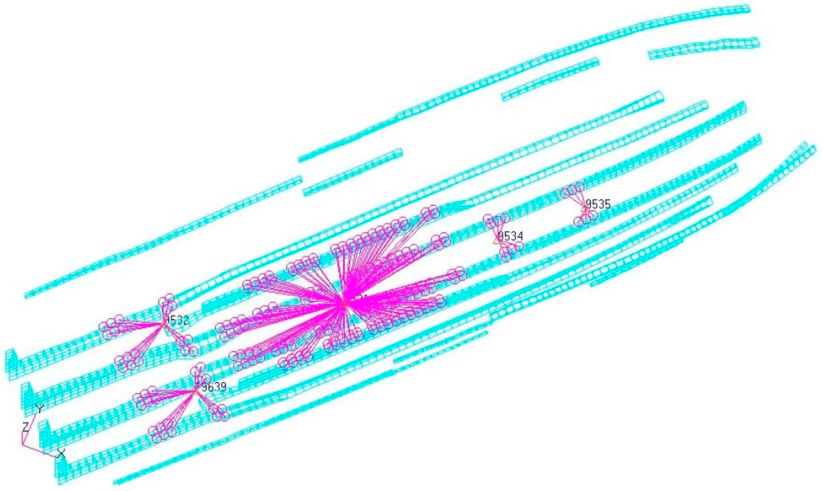 Table 8). The magenta vectors represent the direction and magnitude of applied point masses. The cyan mesh shows the structural elements where the masses are assigned.