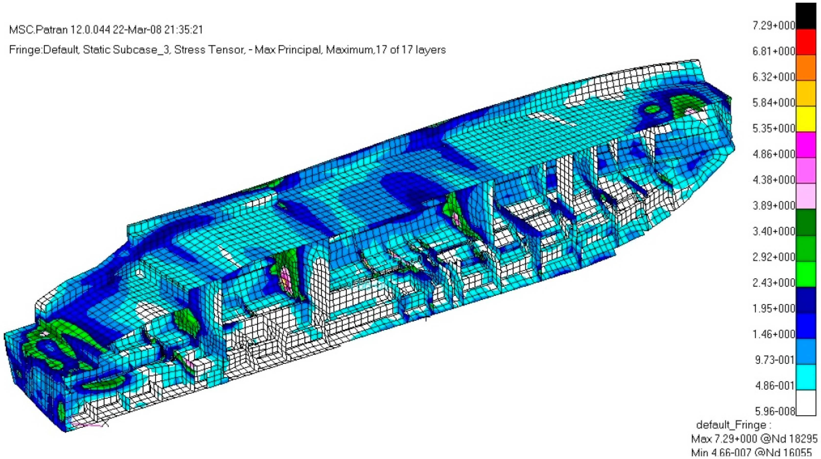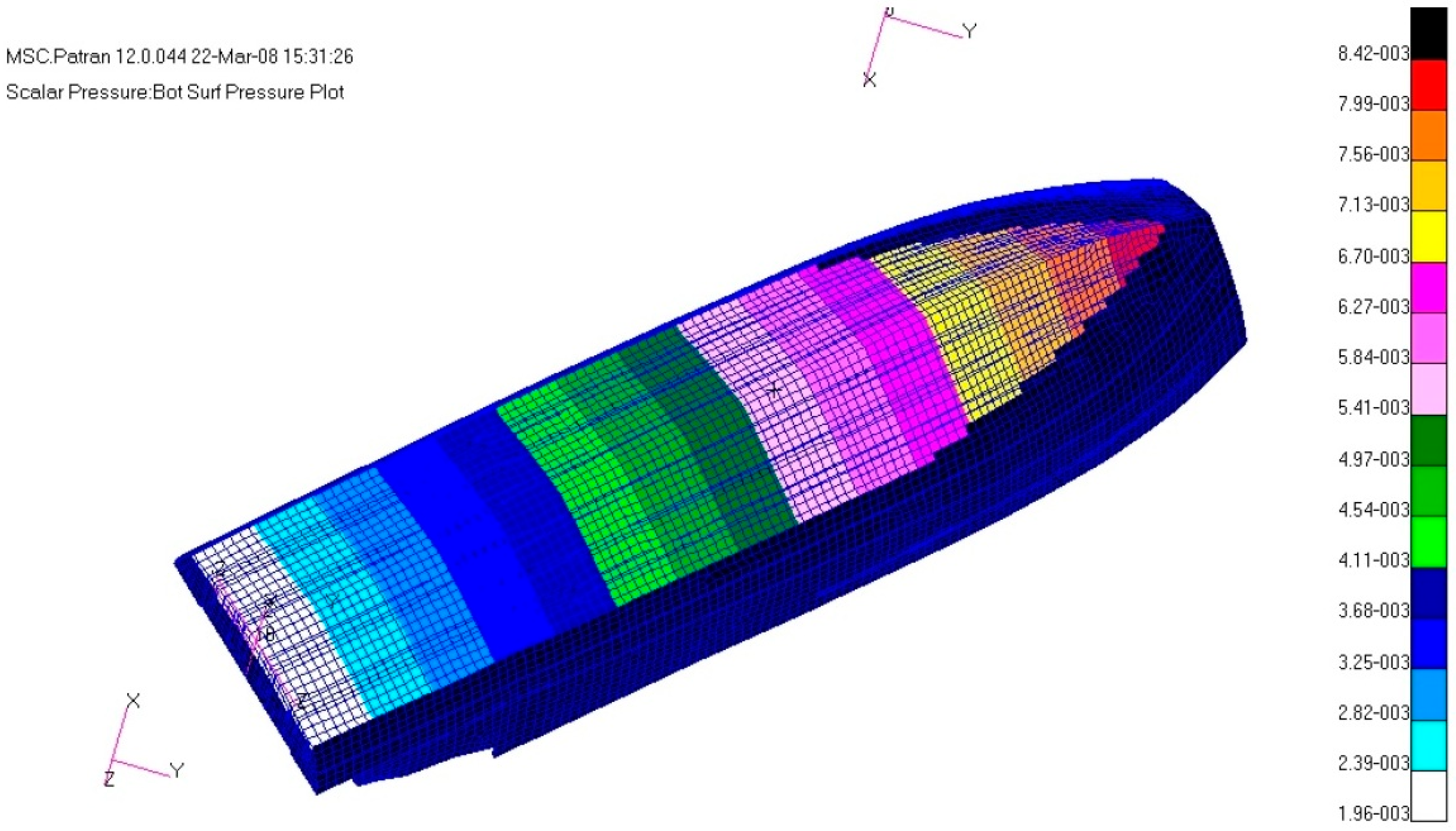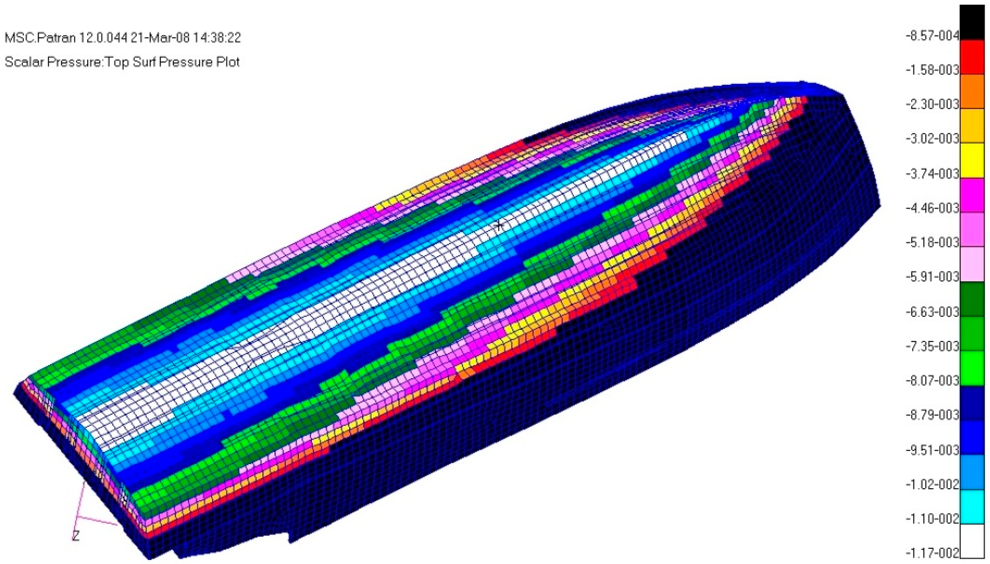 Plot of P(x) generated in Load Case 1 applied on the hull, showing hydrostatic pressure distribution (units in MPa). The “+” symbol indicates the reference origin (global coordinate system) used during model setup.