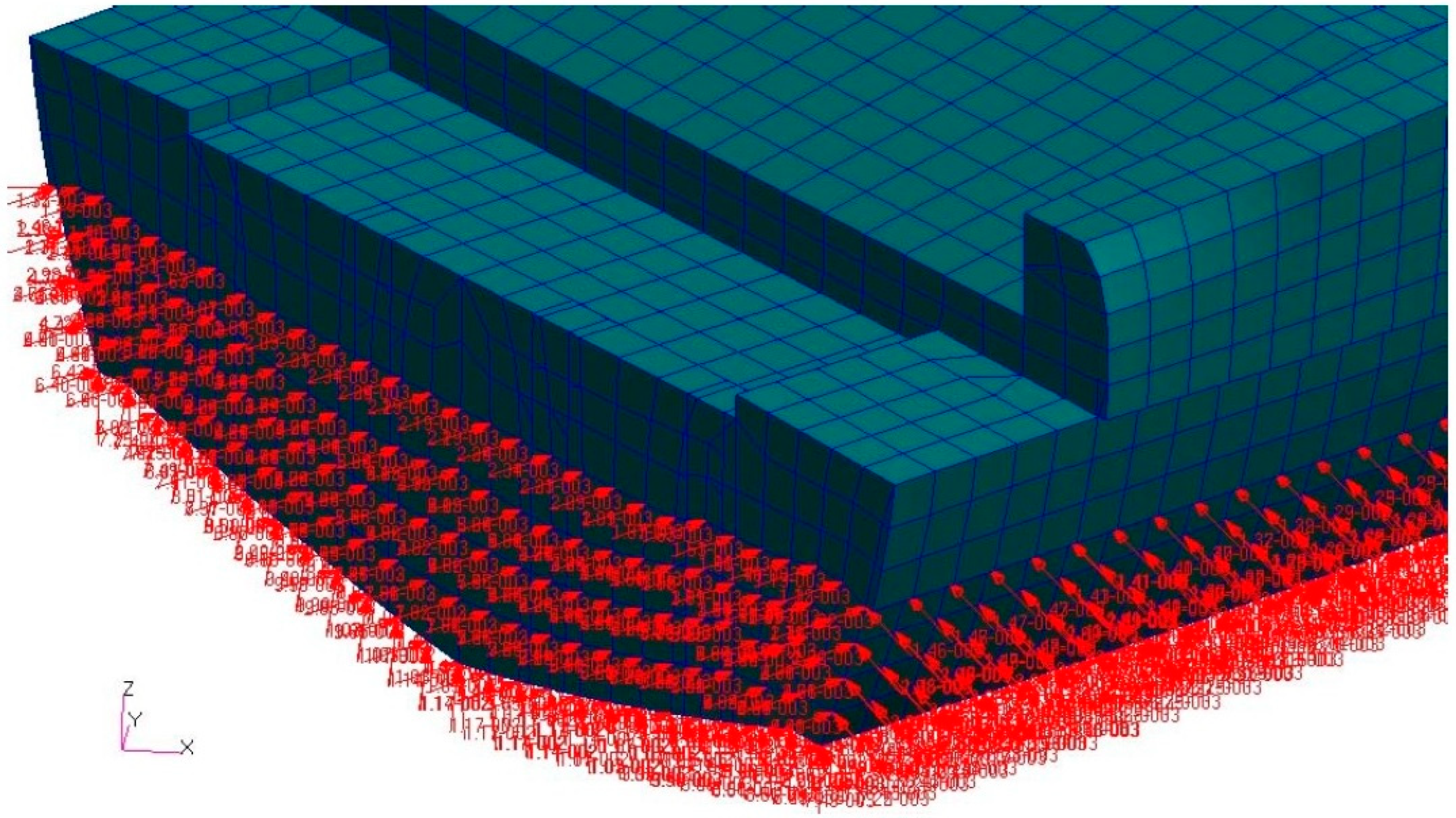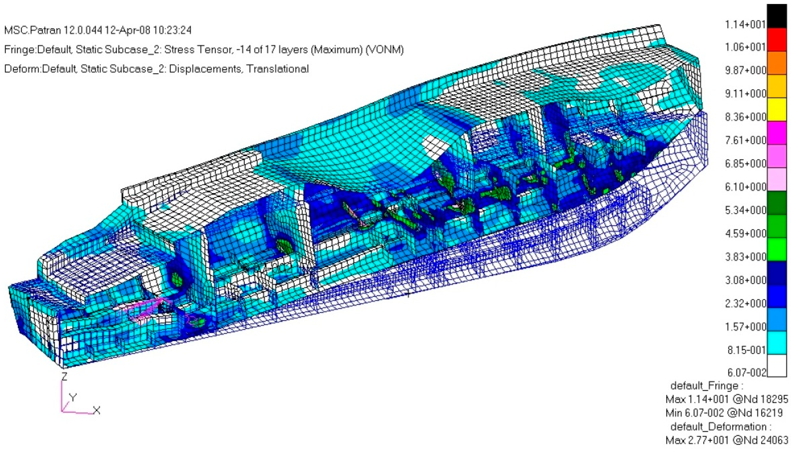 Maximum displacement for Load Case 2, bottom view of the hull. The “+” symbol indicates the reference origin (global coordinate system) used during model setup.