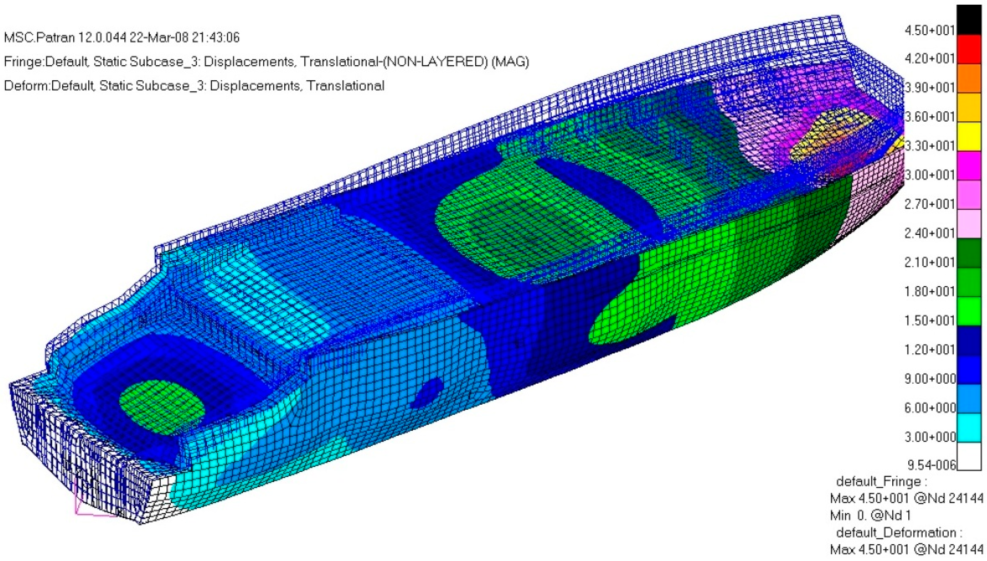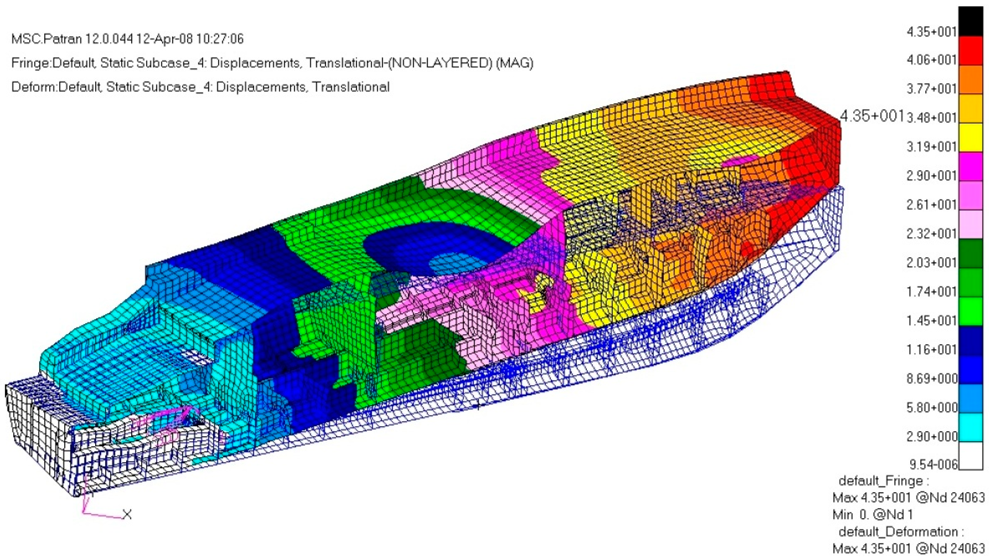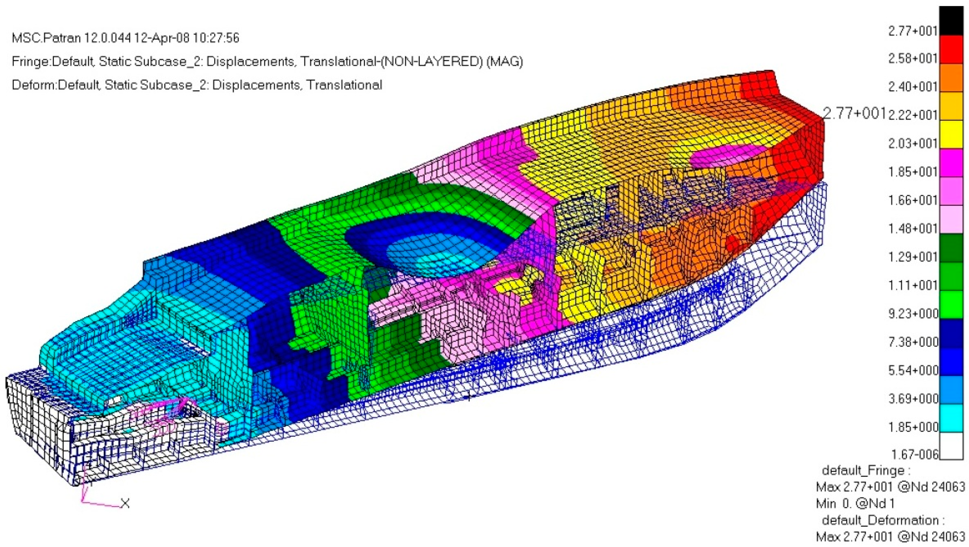 Maximum displacement, bottom hull view, Load Case 1. The “+” symbol indicates the reference origin (global coordinate system) used during model setup.