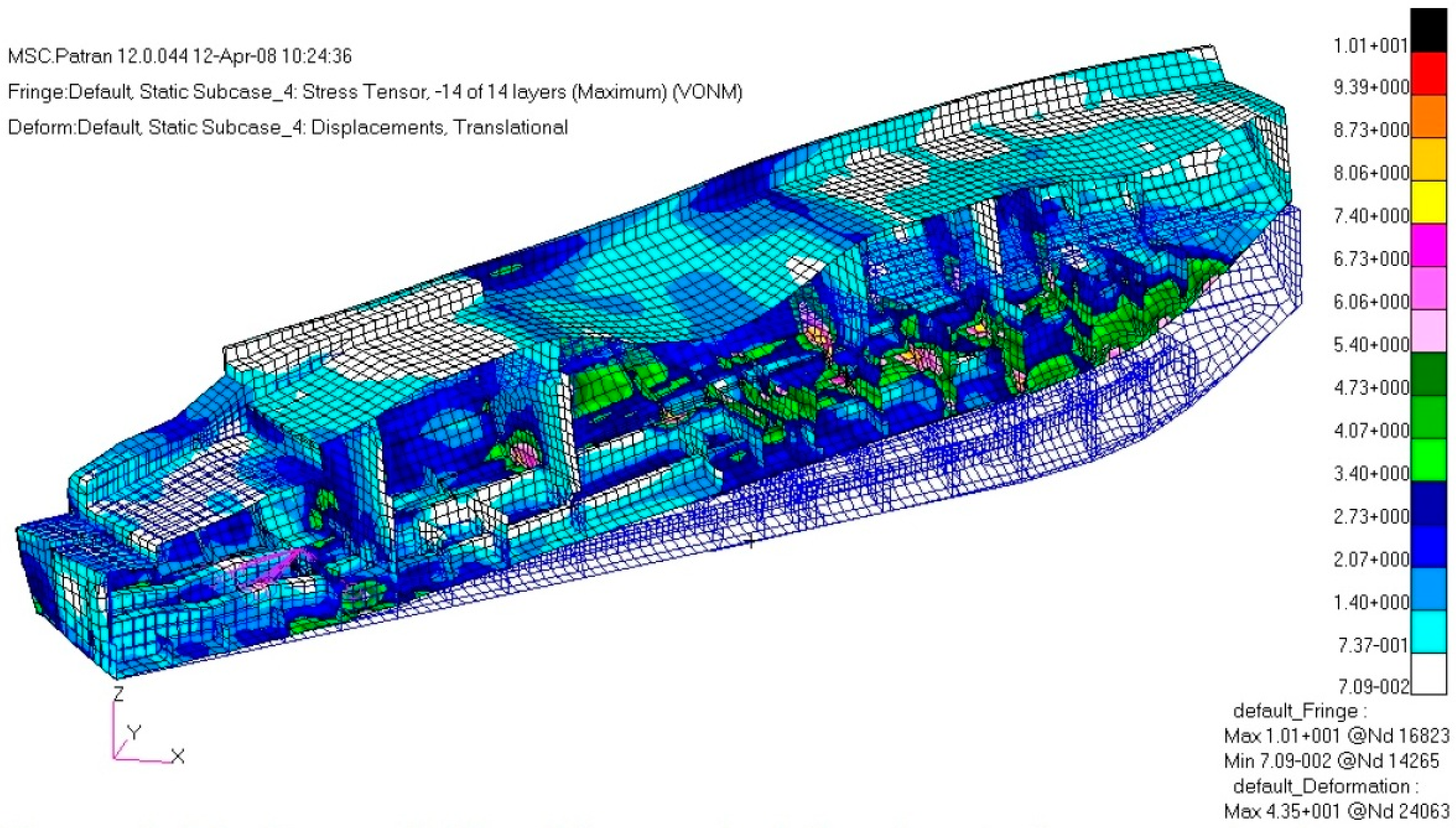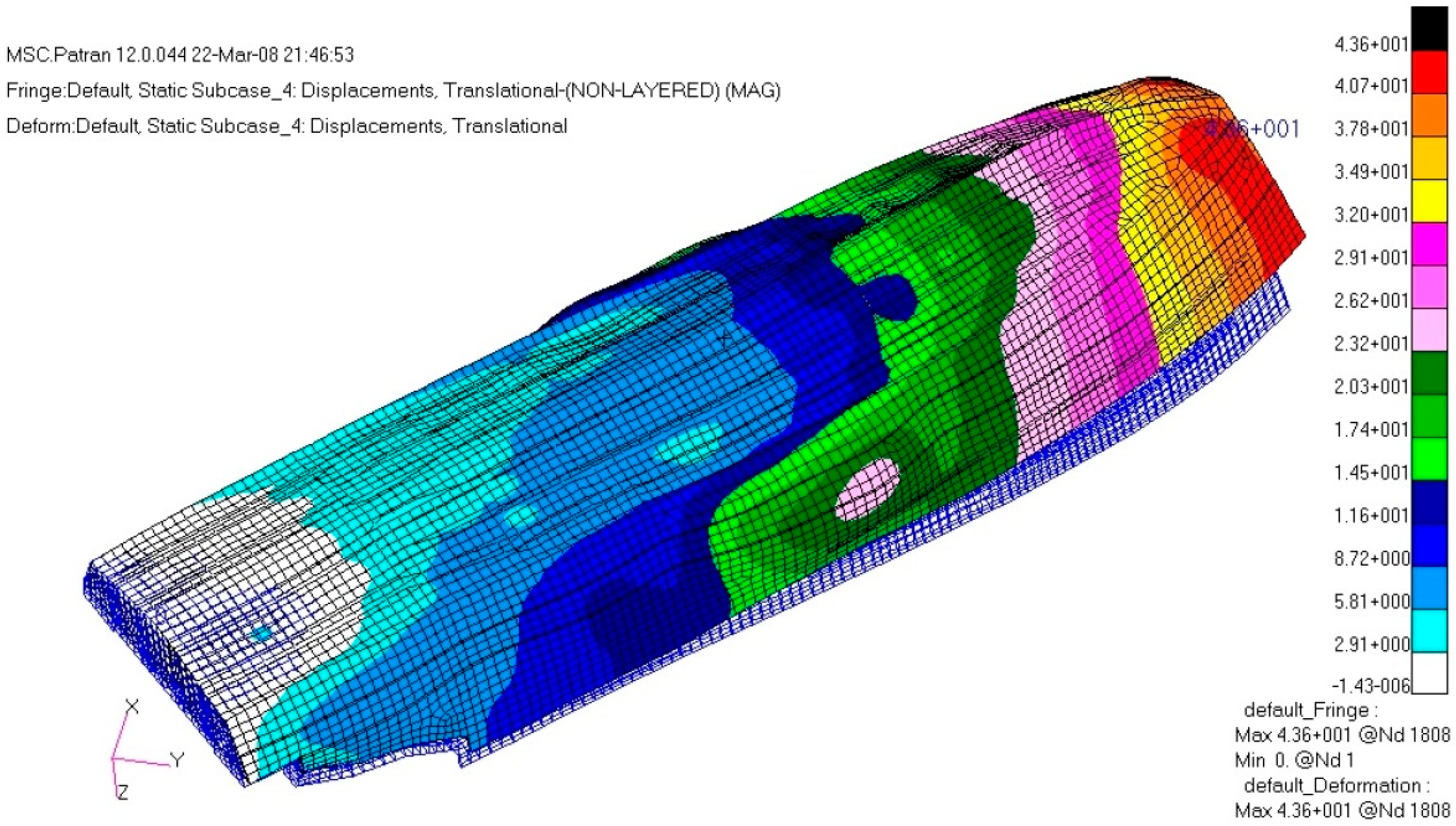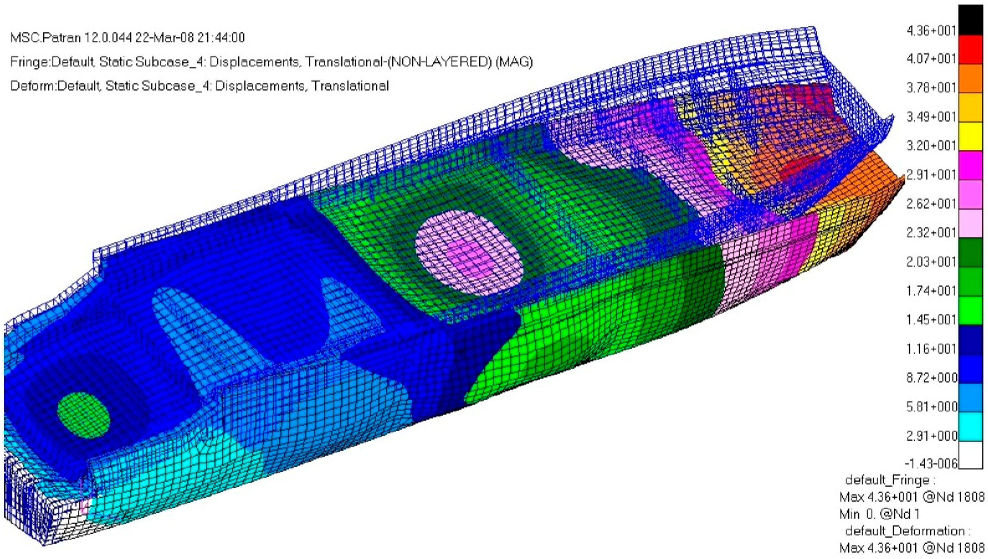 Maximum displacement, bottom hull view, Load Case 1. The “+” symbol indicates the reference origin (global coordinate system) used during model setup.