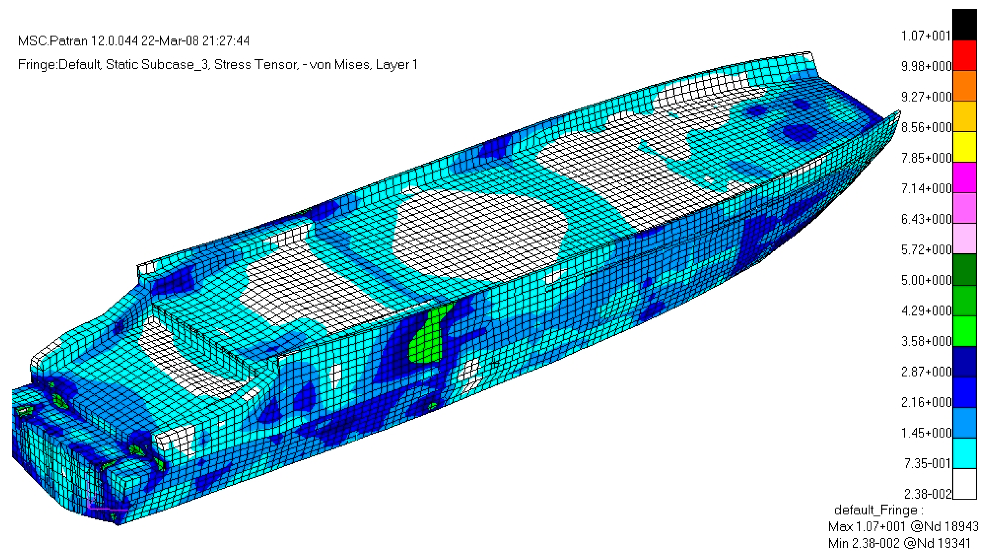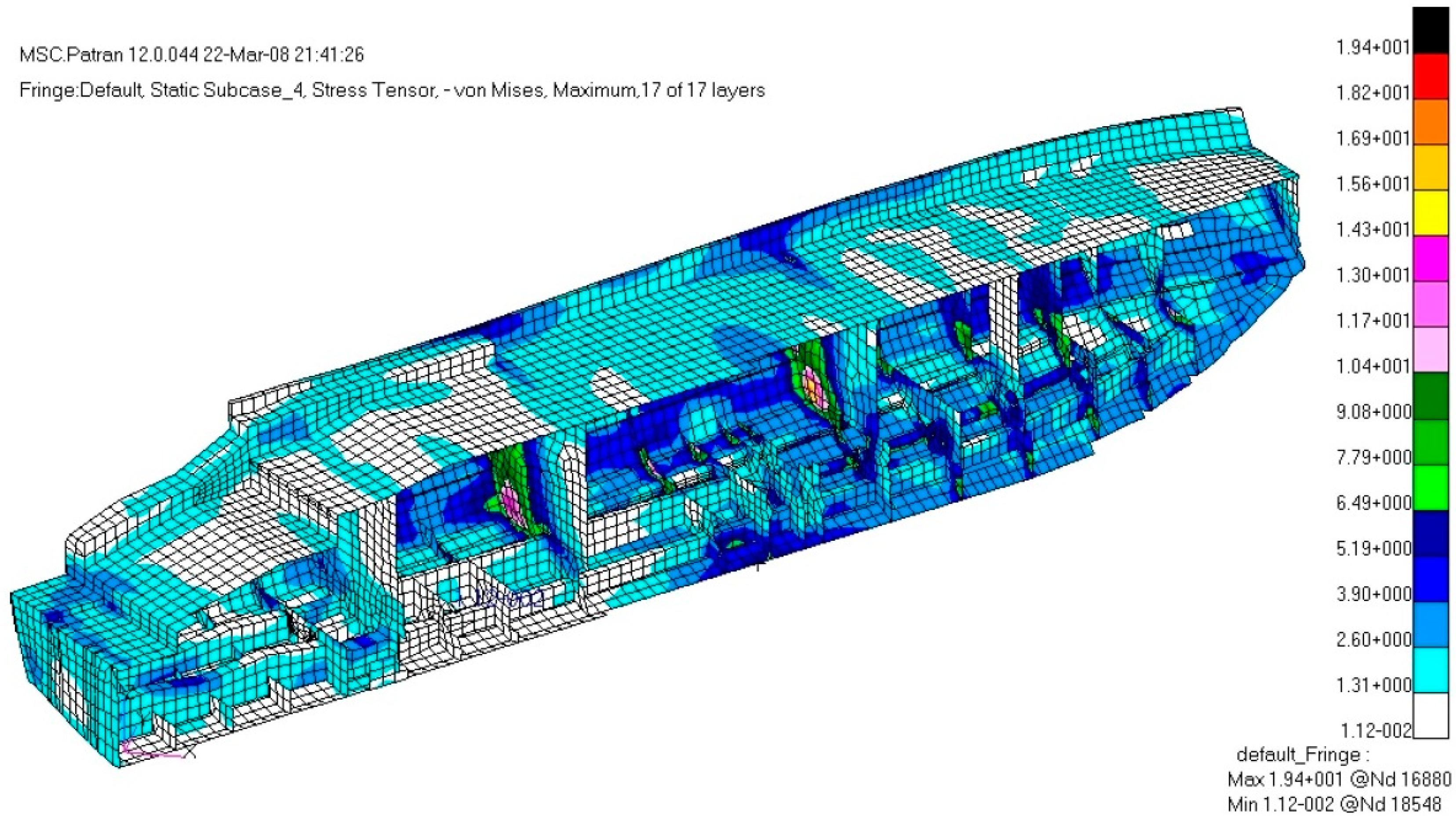 Maximum Von Mises stress for Load Case 2, hull cross-sectional view.