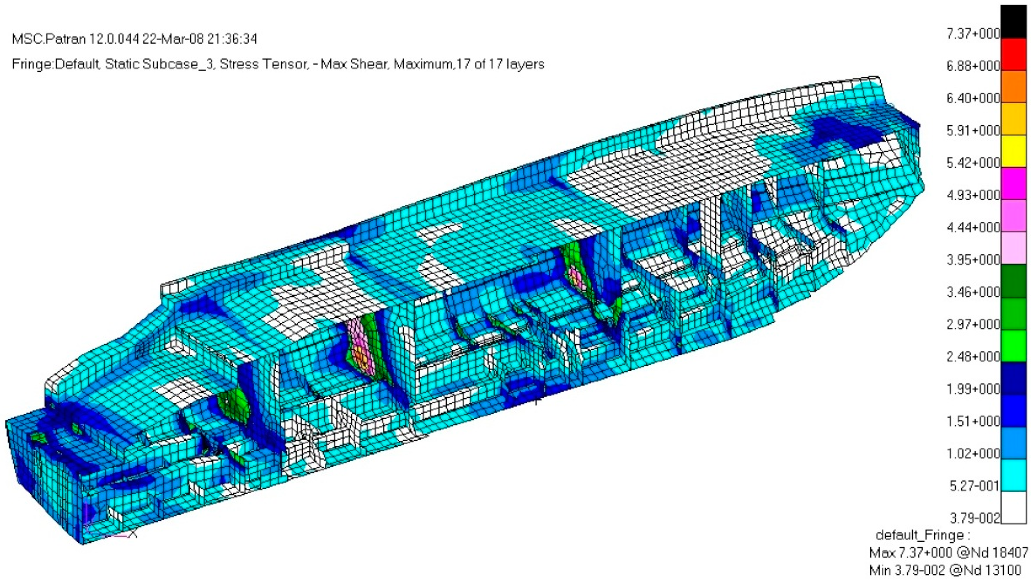 Maximum shear stress for Load Case 2, hull cross-sectional view.