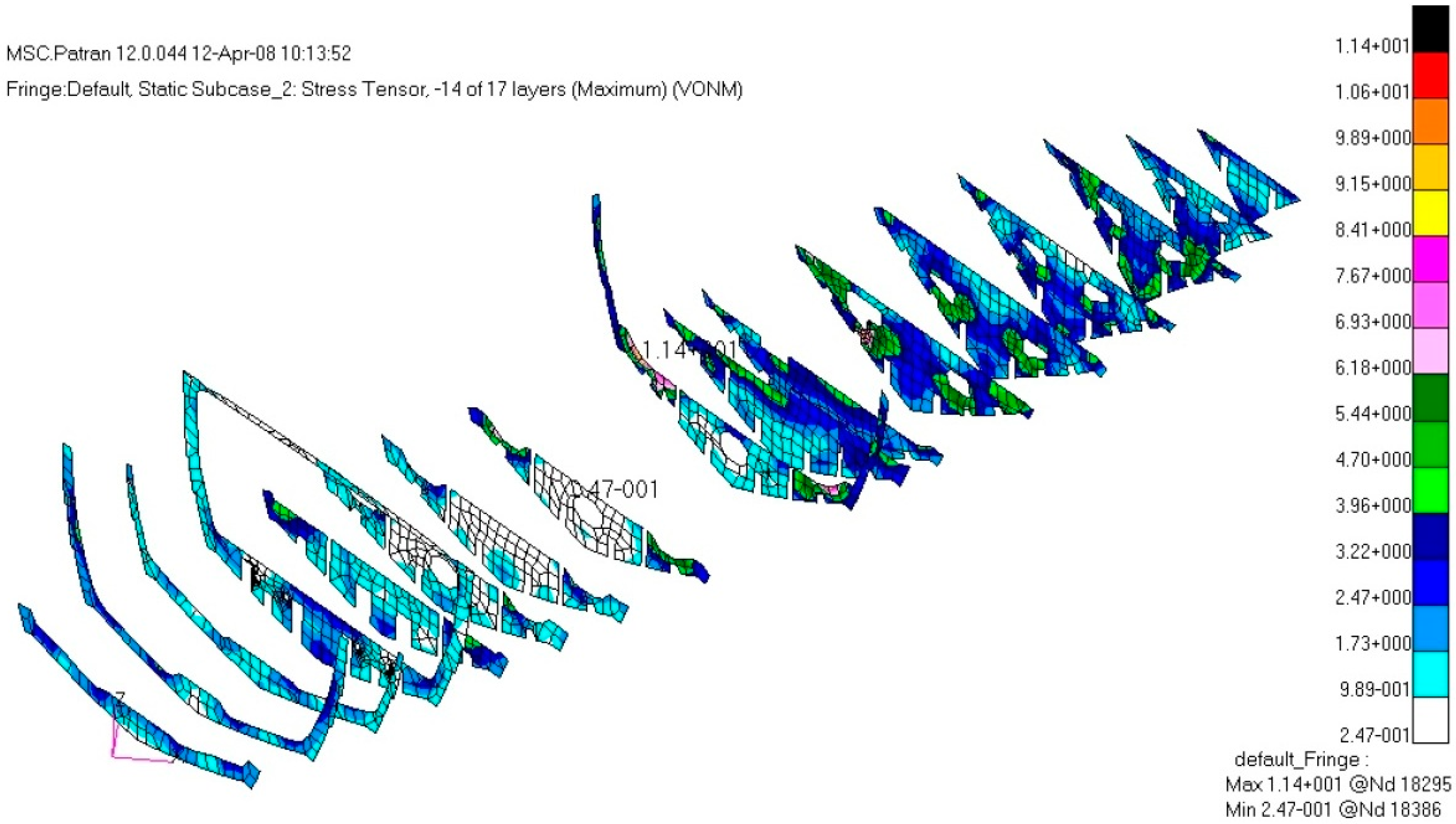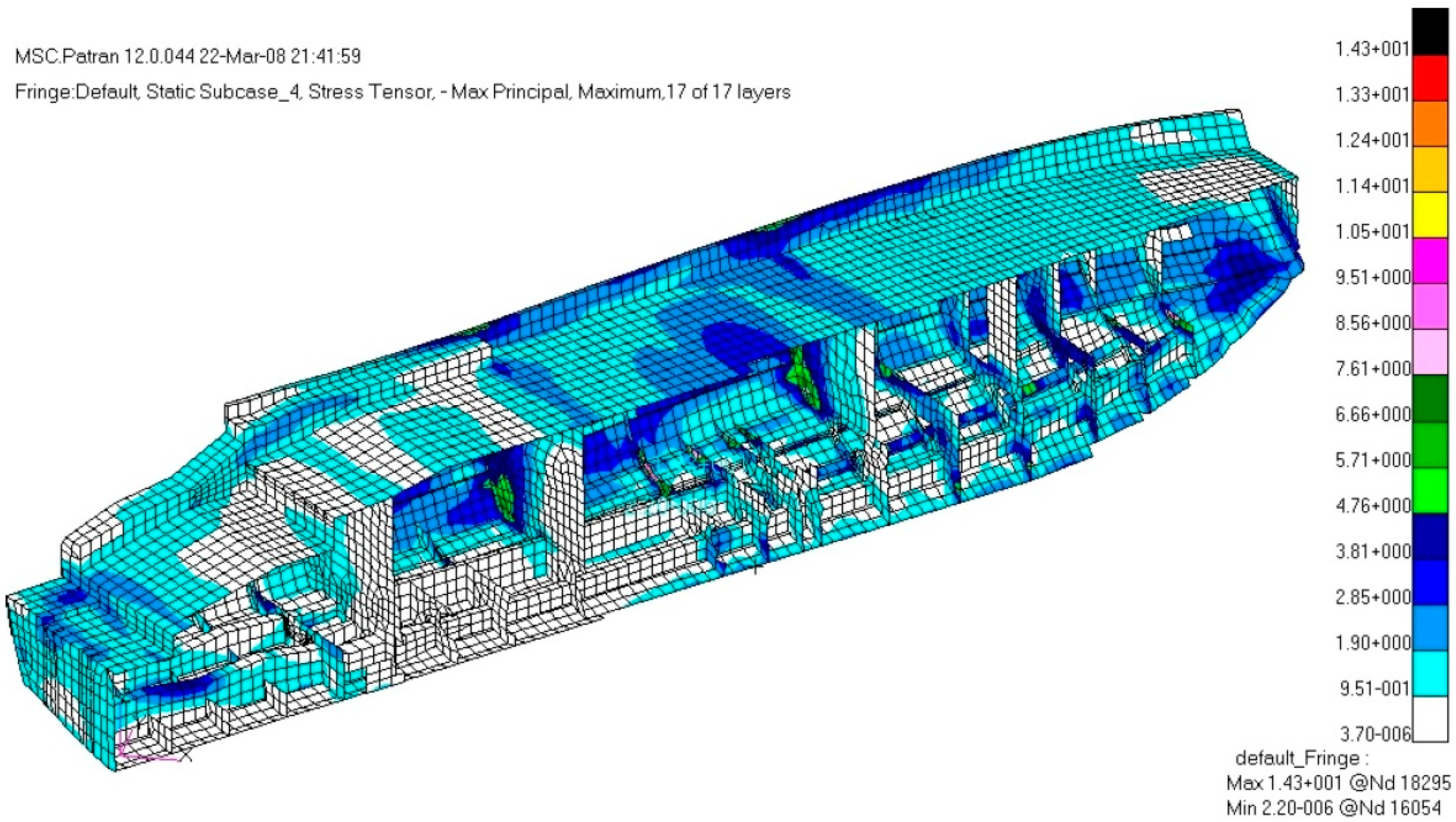 Maximum tensile stress for Load Case 2, hull cross-sectional view.