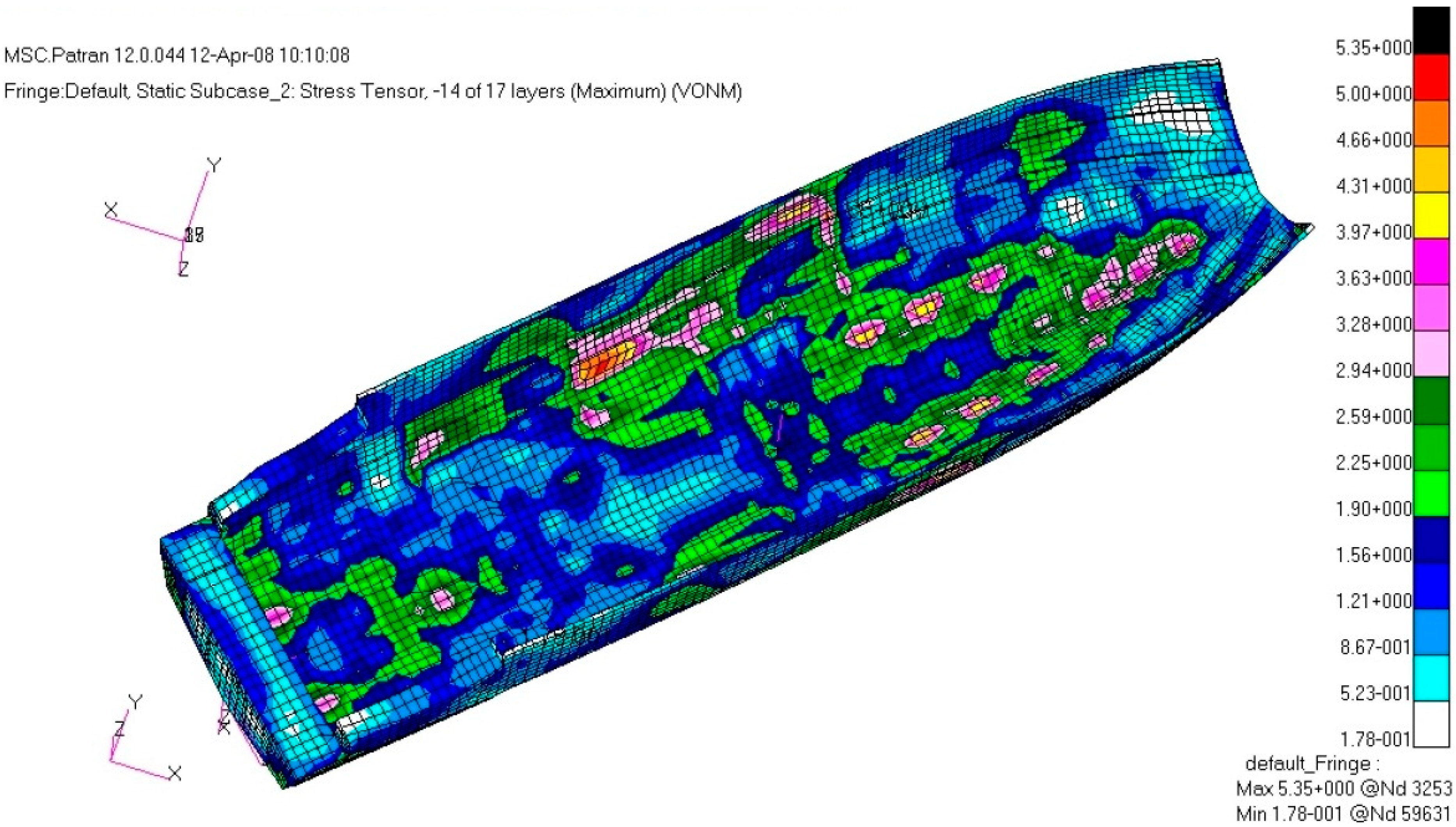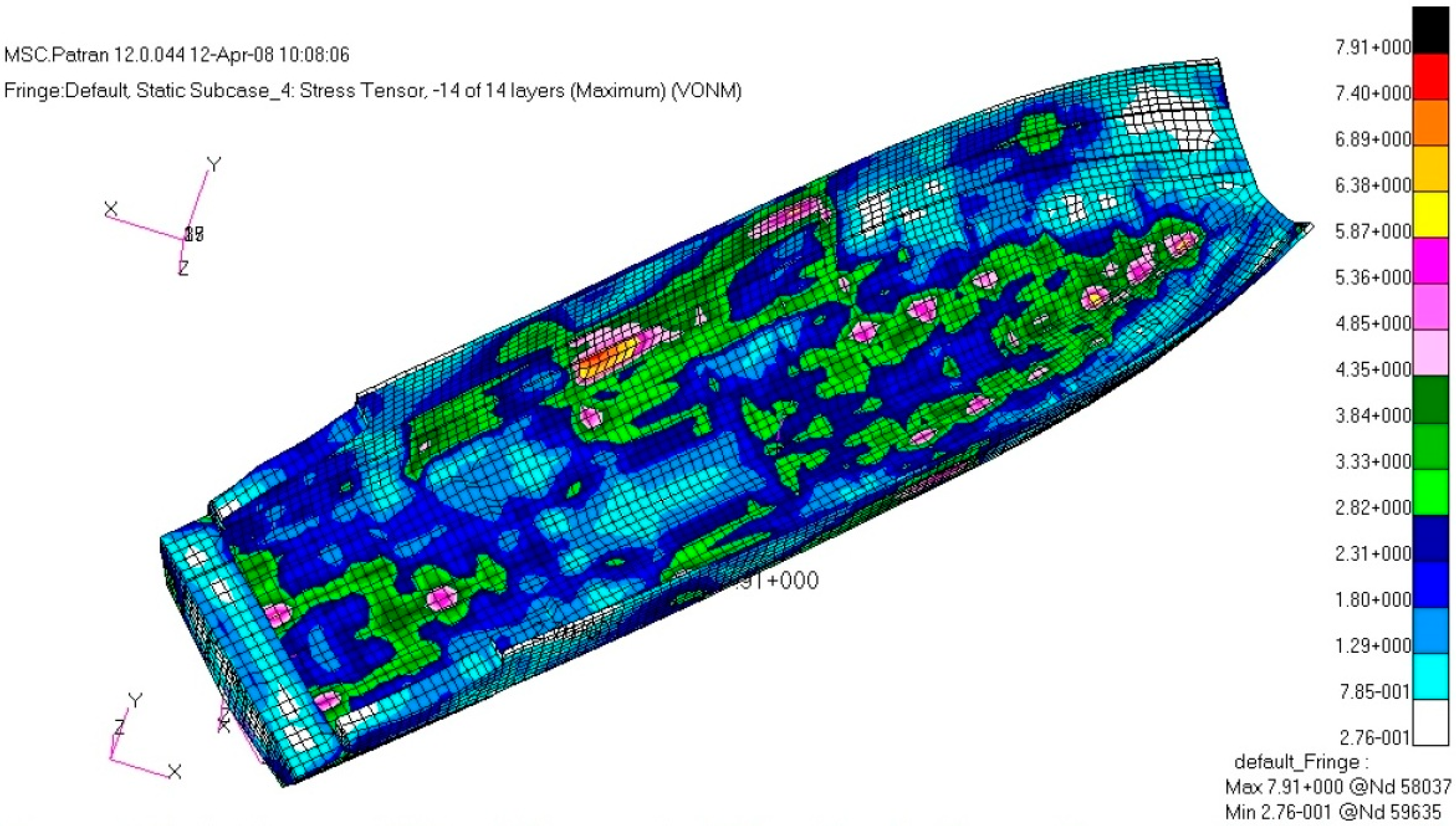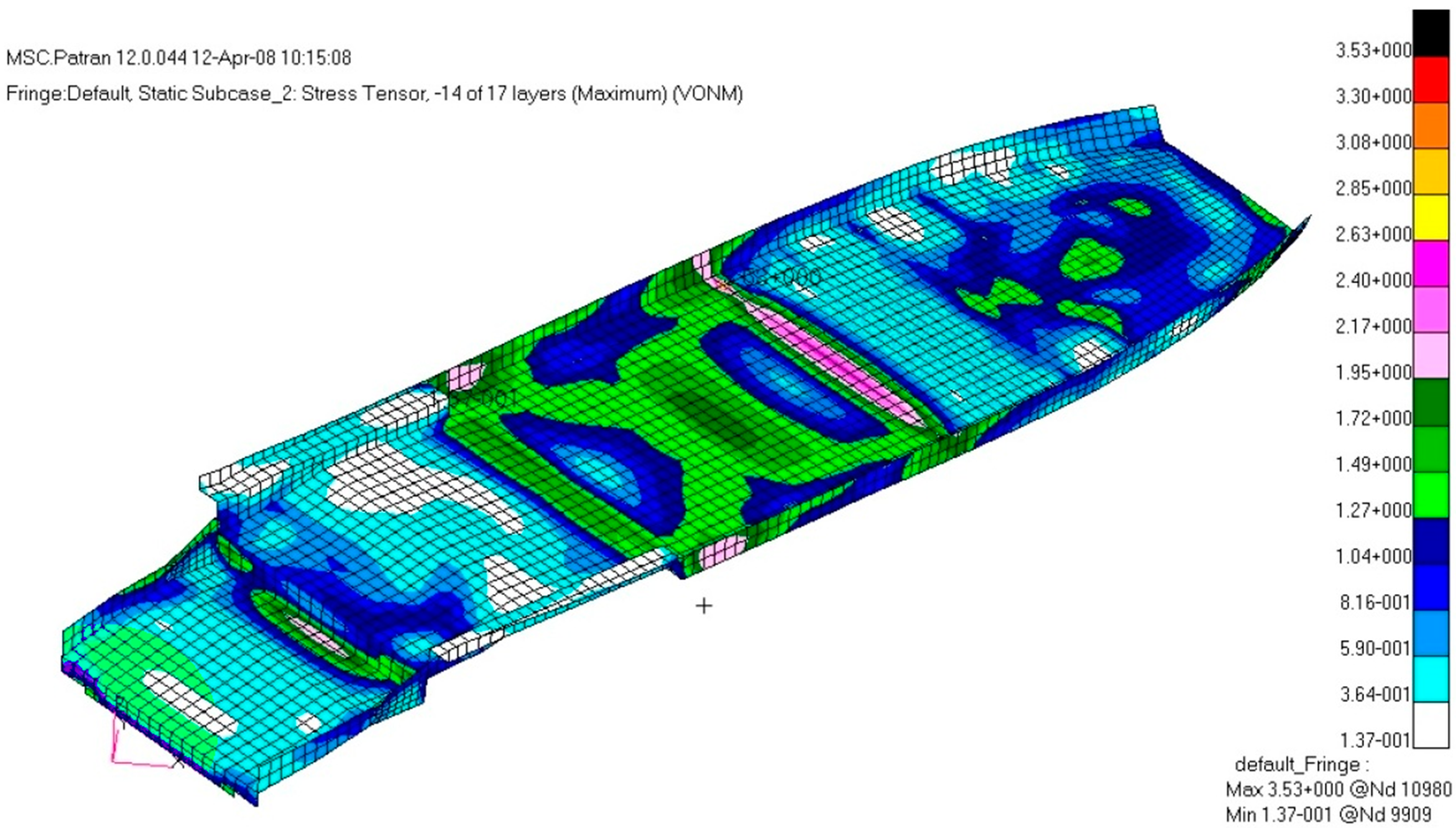 Von Mises stress on the deck panel structure before optimization. The “+” symbol indicates the reference origin (global coordinate system) used during model setup.