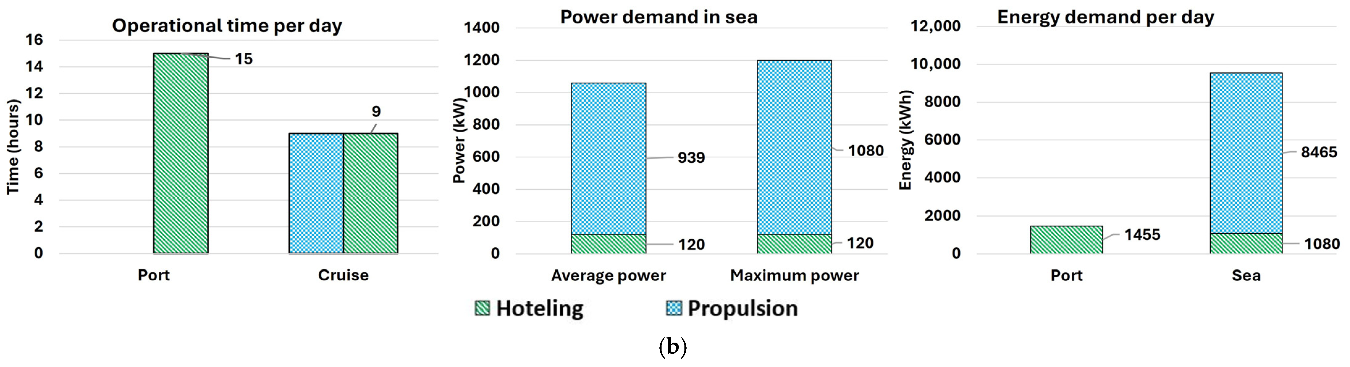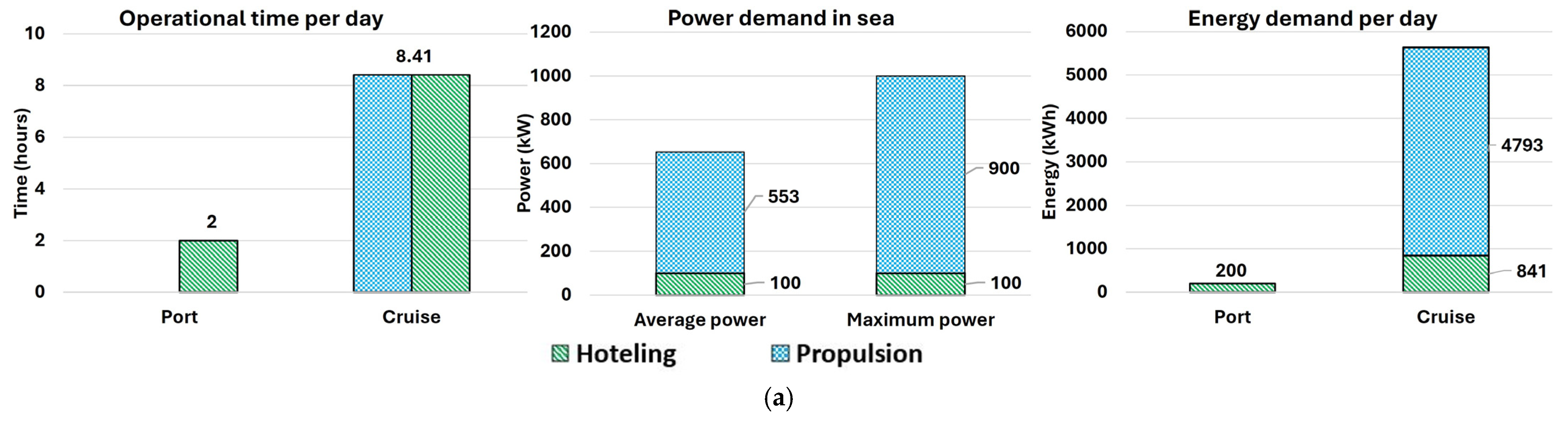 - Elkafas, A.G.; Rivarolo, M.; Barberis, S.; Massardo, A.F. Feasibility Assessment of Alternative Clean Power Systems Onboard Passenger Short-Distance Ferry. J. Mar. Sci. Eng. 2023, 11, 1735. [Google Scholar] [CrossRef]