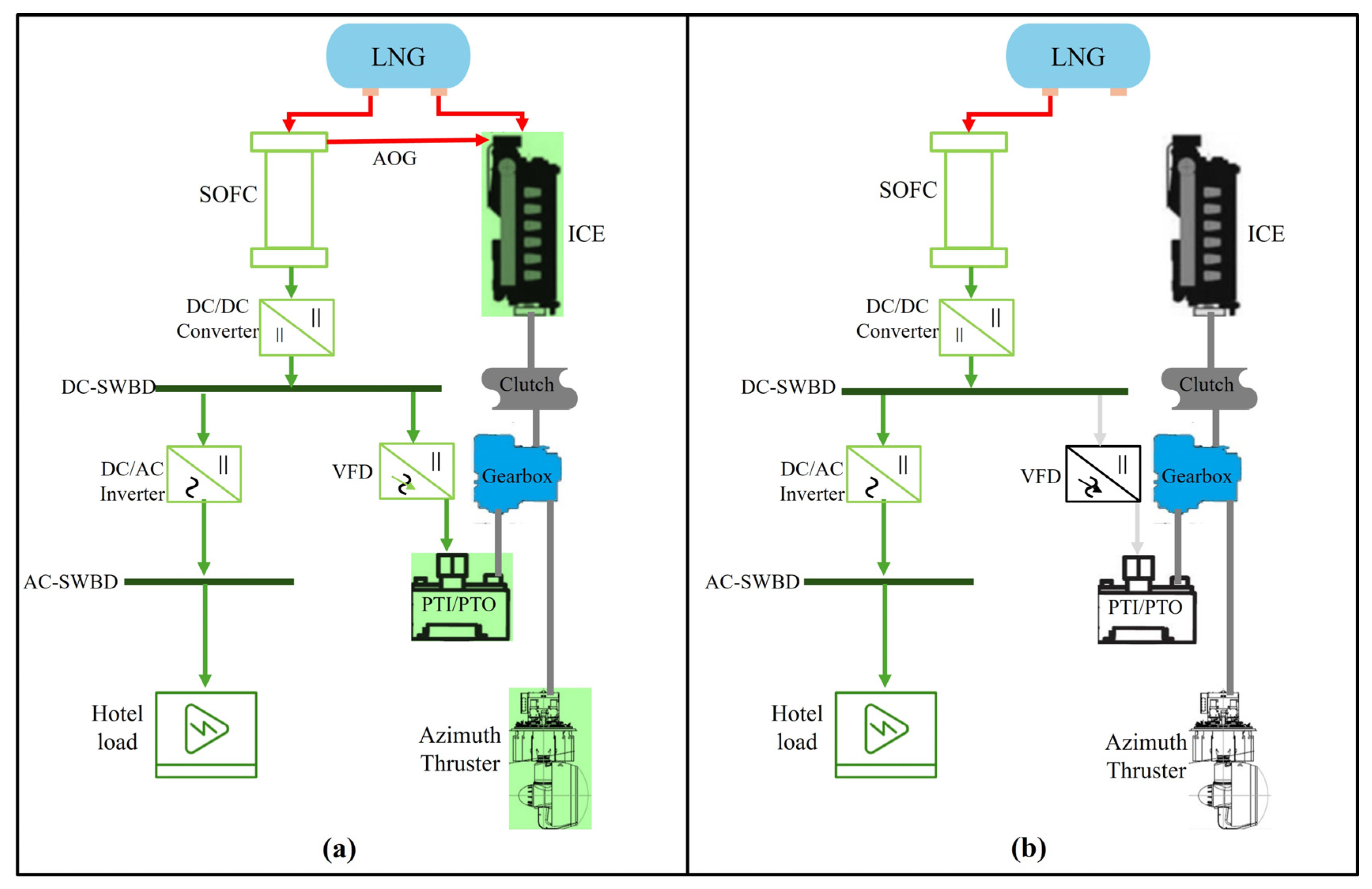 - Sapra, H.; Stam, J.; Reurings, J.; van Biert, L.; van Sluijs, W.; de Vos, P.; Visser, K.; Vellayani, A.P.; Hopman, H. Integration of Solid Oxide Fuel Cell and Internal Combustion Engine for Maritime Applications. Appl. Energy 2021, 281, 115854. [Google Scholar] [CrossRef]