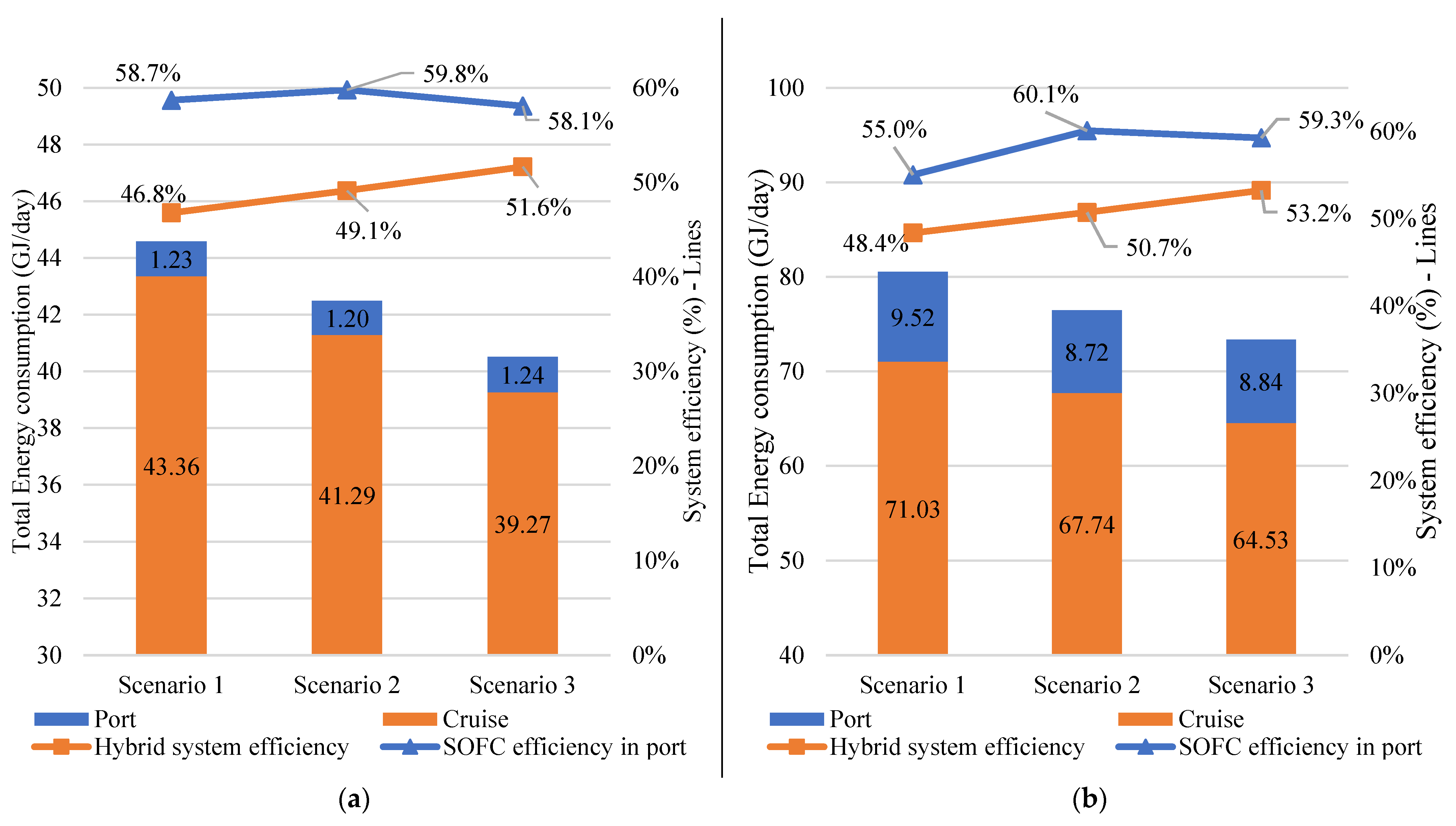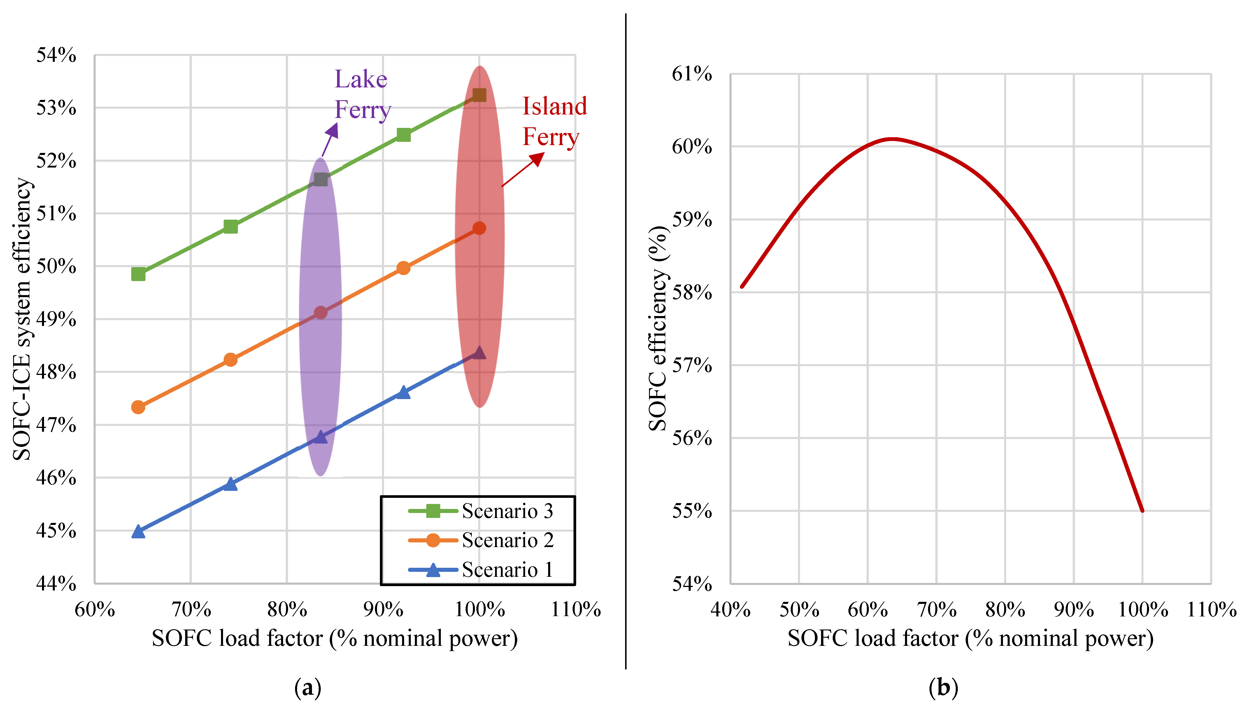 - The energy analysis demonstrates that increasing the SOFC power share enhances overall system efficiency. The SOFC efficiency in port operations improved to approximately 60% under part-load conditions, while the hybrid system efficiency in cruise mode reached 53.2%. This yielded daily fuel energy reductions of up to 9.1% for the Lake Ferry and 8.9% for the Island Ferry. The integrated degradation model revealed that higher SOFC shares also reduce the relative lifecycle fuel penalty, with cumulative consumption increasing by only 4.3% for the Lake Ferry and 4.8% for the Island Ferry over 25 years compared to a non-degrading baseline.