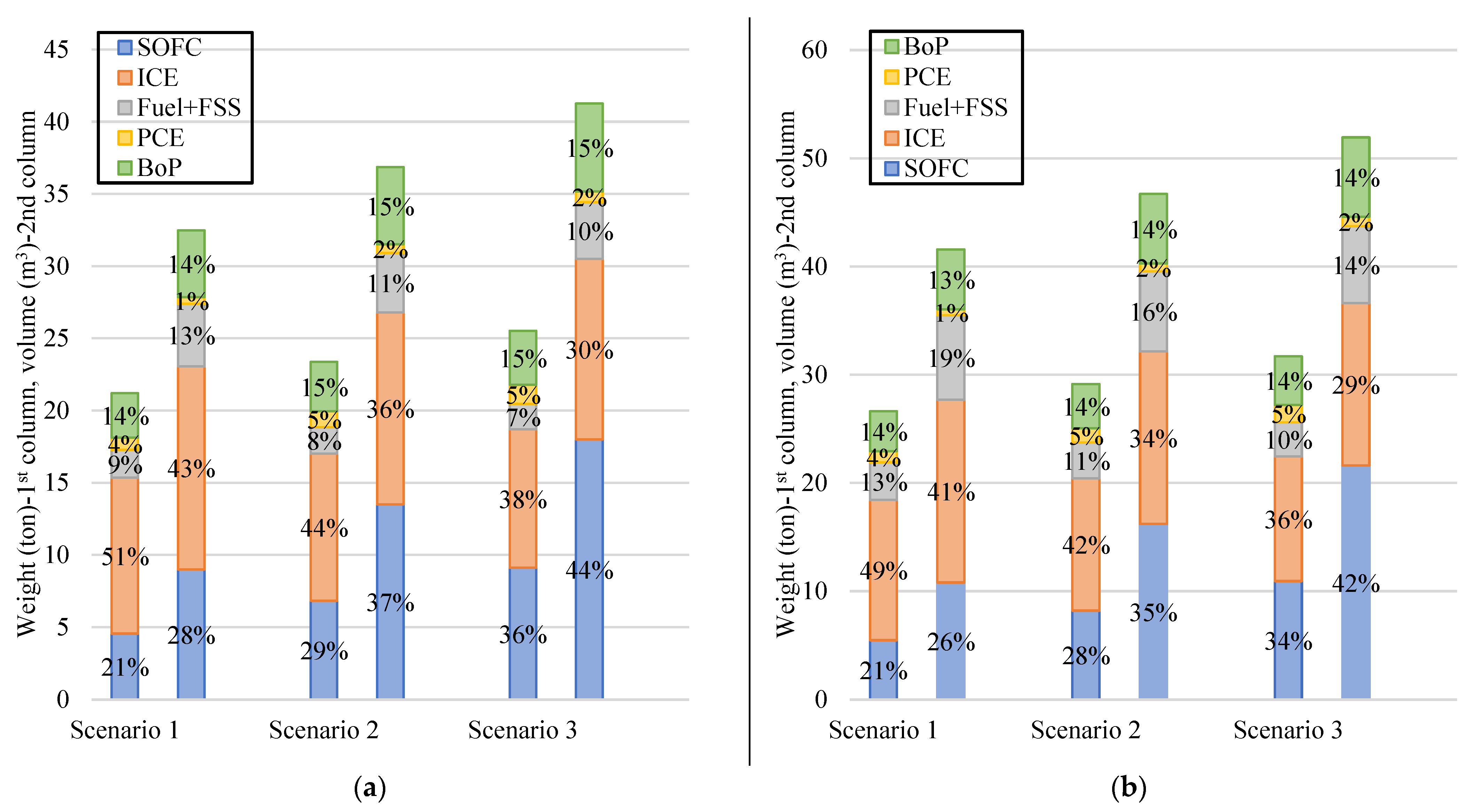 - The design analysis confirms the physical retrofit feasibility of the SOFC-ICE hybrid system, despite increased mass and volume with higher SOFC shares. For the highest integration (Scenario 3, 20% SOFC share), total system weight for the Lake Ferry increases by 20% (19% for the Island Ferry) and volume by 27% (25% for the Island Ferry) compared to Scenario 1 (10% SOFC share), due to the SOFC’s lower power density. Crucially, a quantitative space-claim analysis demonstrated that all scenarios remain within the vessels’ available machinery space, with occupancy ratios of 72–92% for the Lake Ferry and 73–91% for the Island Ferry, confirming that the systems are installable without exceeding spatial constraints.