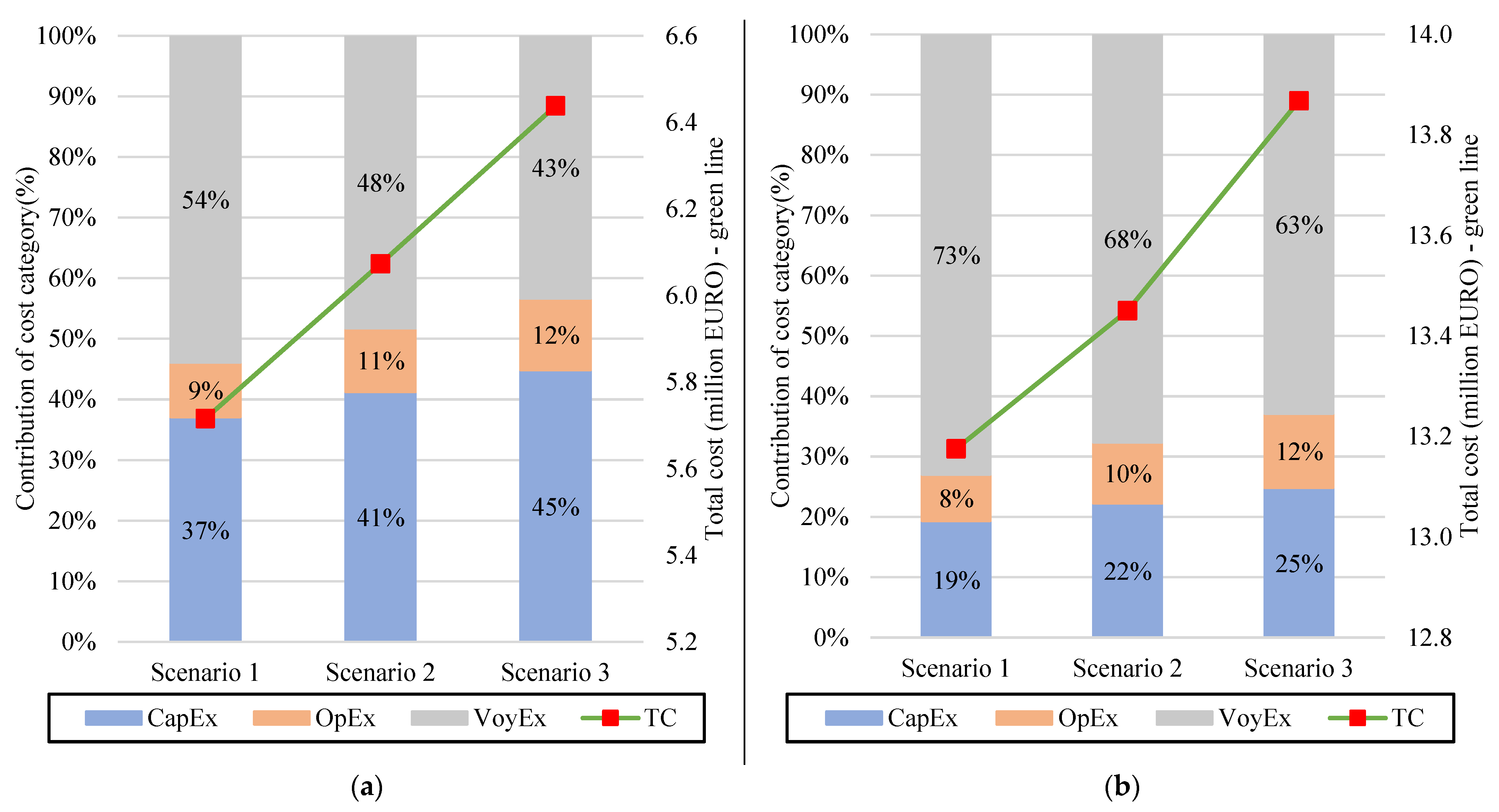 | Vessel | Scenario | Year 1 (BoL) | Year 8 | Year 16 | Year 25 (EoL) | Cumulative Increase |