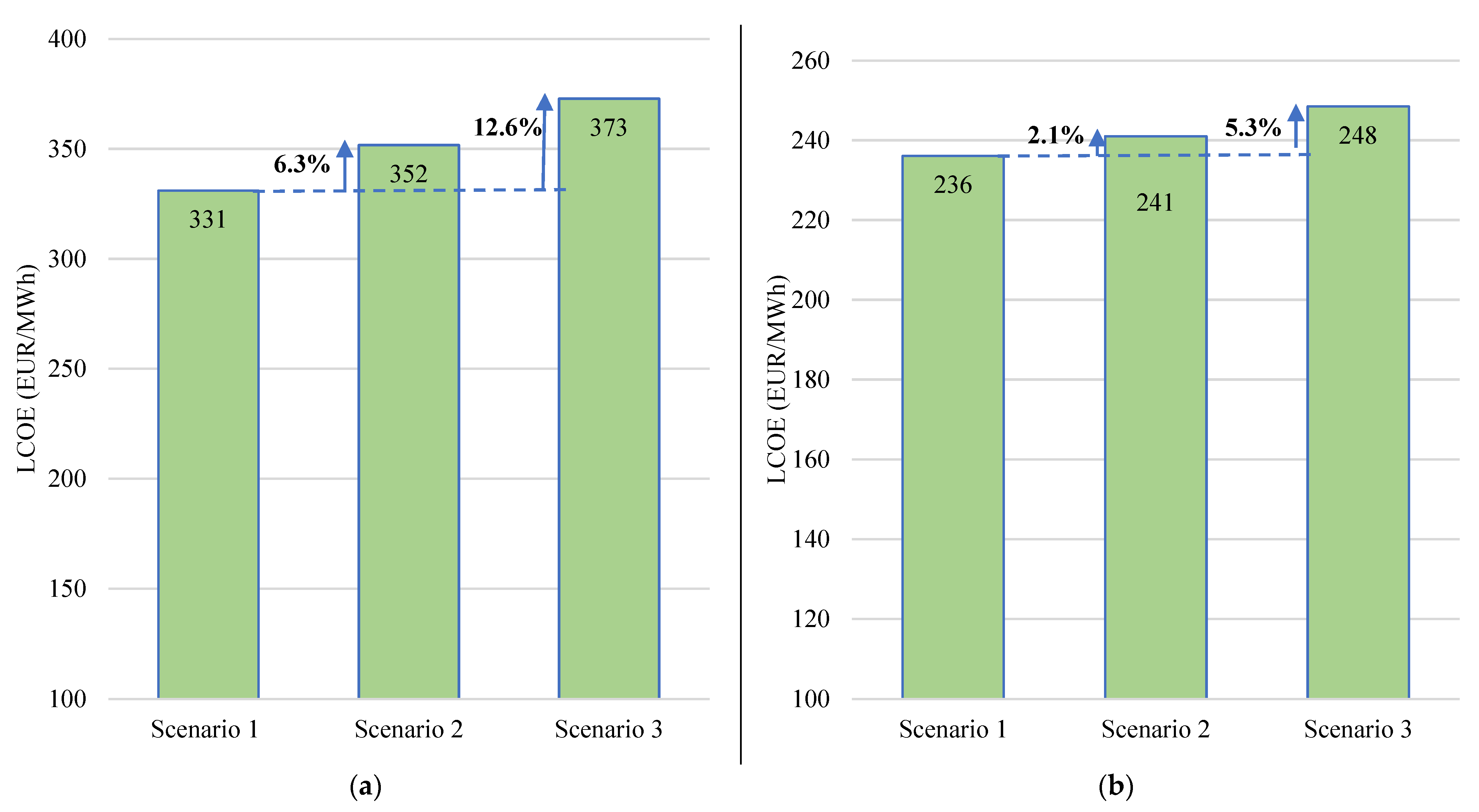 - Economically, the hybrid system presents a trade-off between high capital investment and operational savings. For the Island Ferry with high utilization, the Levelized Cost of Energy (LCOE) remained competitive (236–248 EUR/MWh) across all scenarios, as fuel savings (VoyEx) partially offset the increased SOFC capital and operational costs. In contrast, the Lake Ferry’s lower operating hours resulted in a higher LCOE (331–373 EUR/MWh), making the economic case more sensitive to the SOFC share.