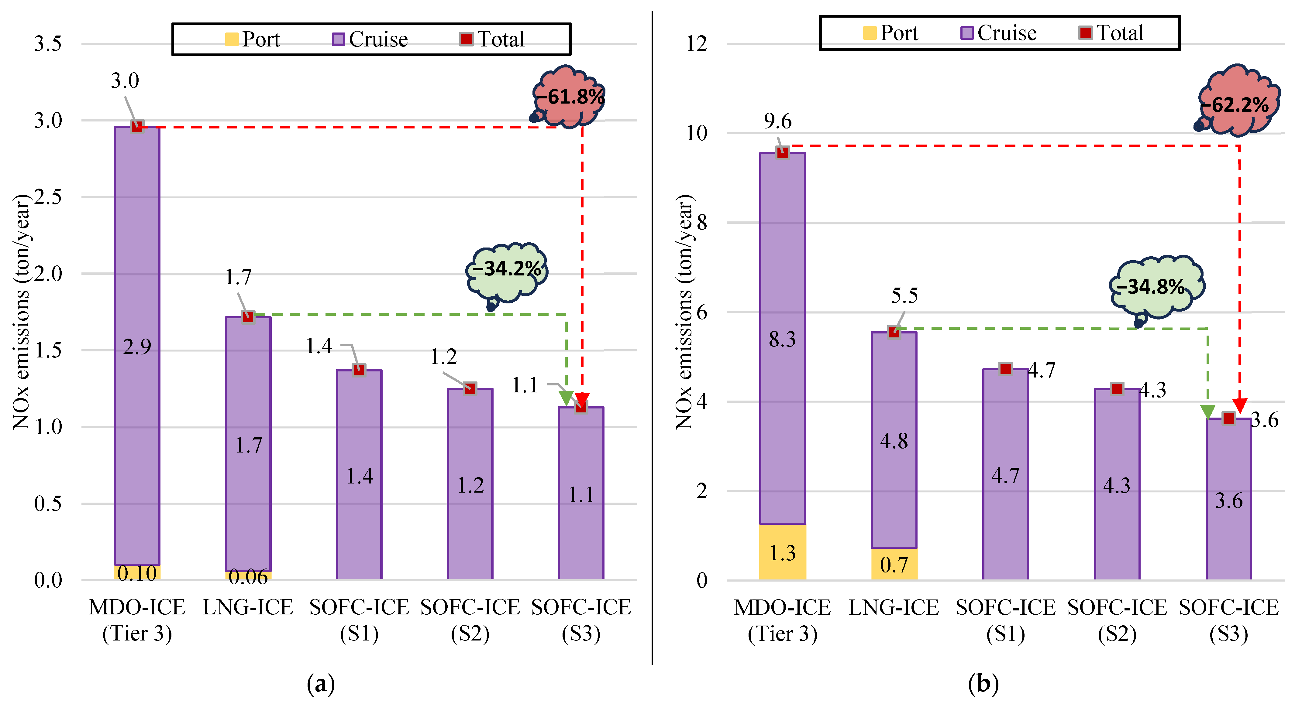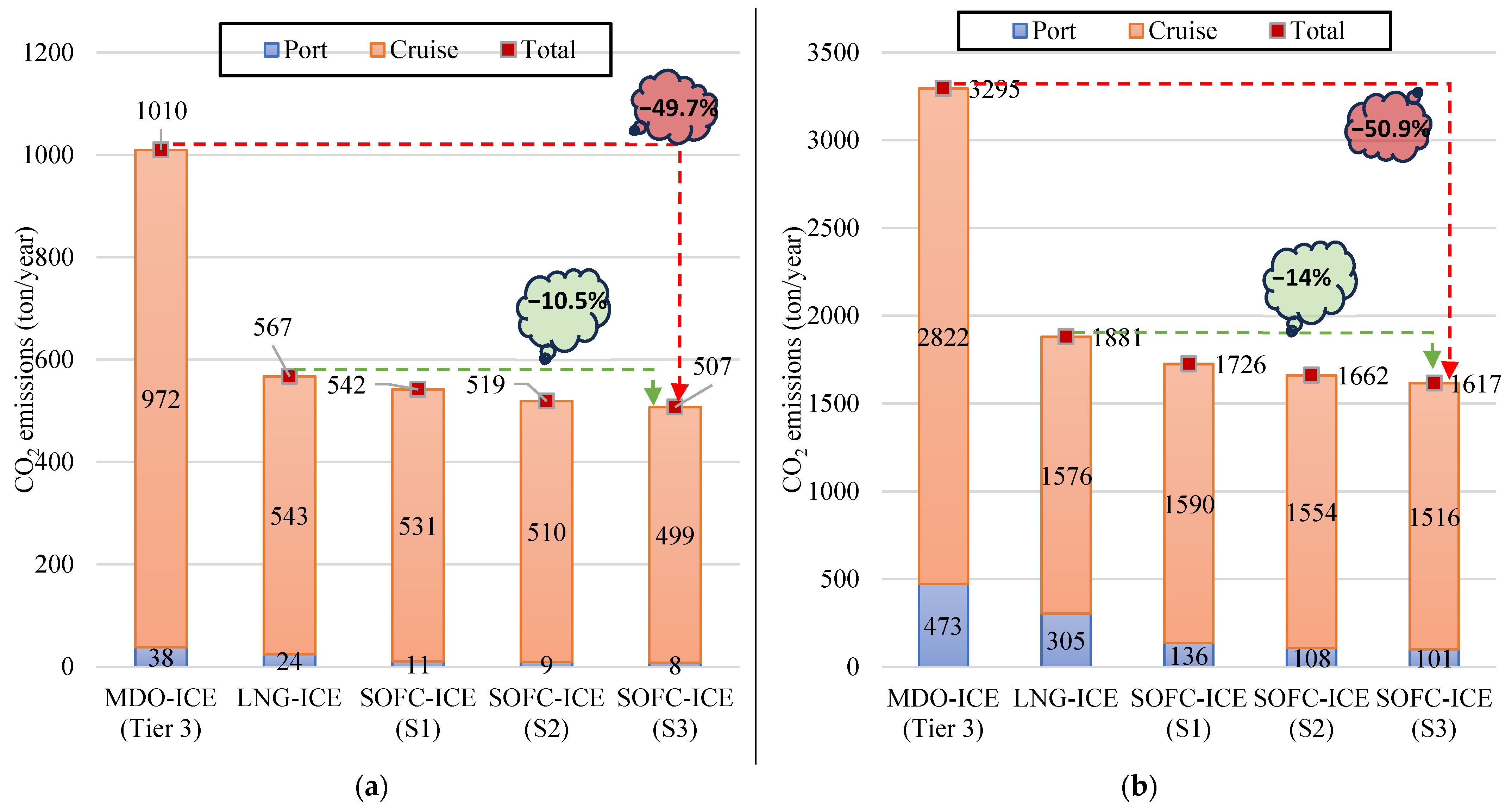 - The SOFC-ICE hybrid system delivers substantial emission reductions, positioning it as a viable transitional decarbonization technology. Compared to conventional MDO-ICE, the system achieves annual CO2 reductions of 46–51% and NOx reductions of 51–62%, with port-area NOx eliminated entirely. It also outperforms modern LNG-ICE, providing CO2 reductions of 4.5–14% and NOx reductions of 15–35%. These reductions already meet and exceed the IMO’s 2030 GHG reduction targets, with potential for further improvement as SOFC technology matures and higher power shares become feasible.