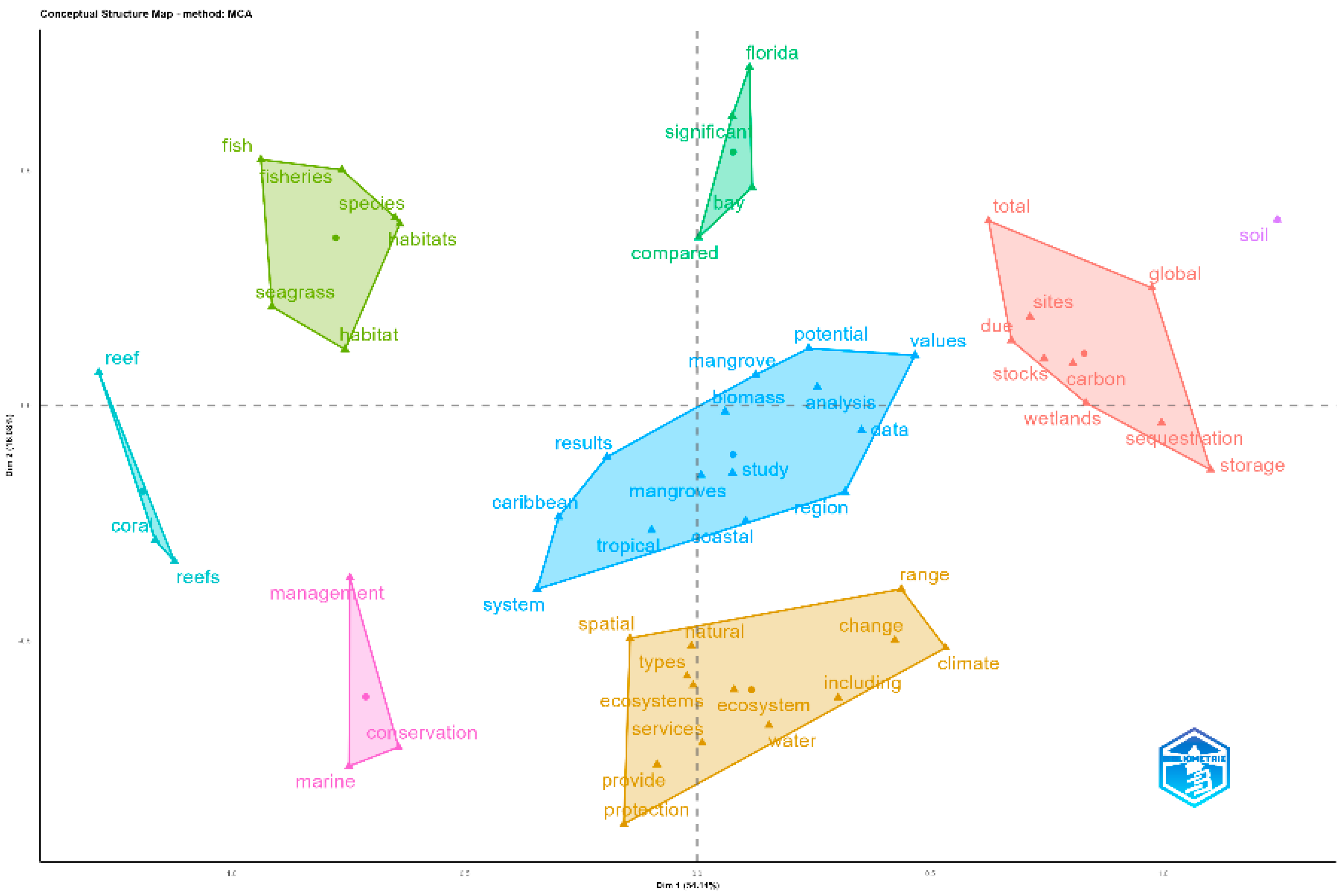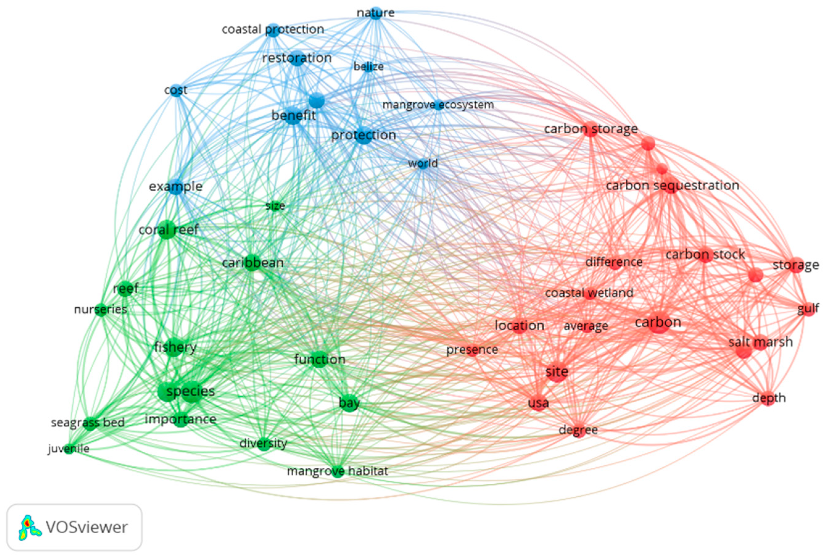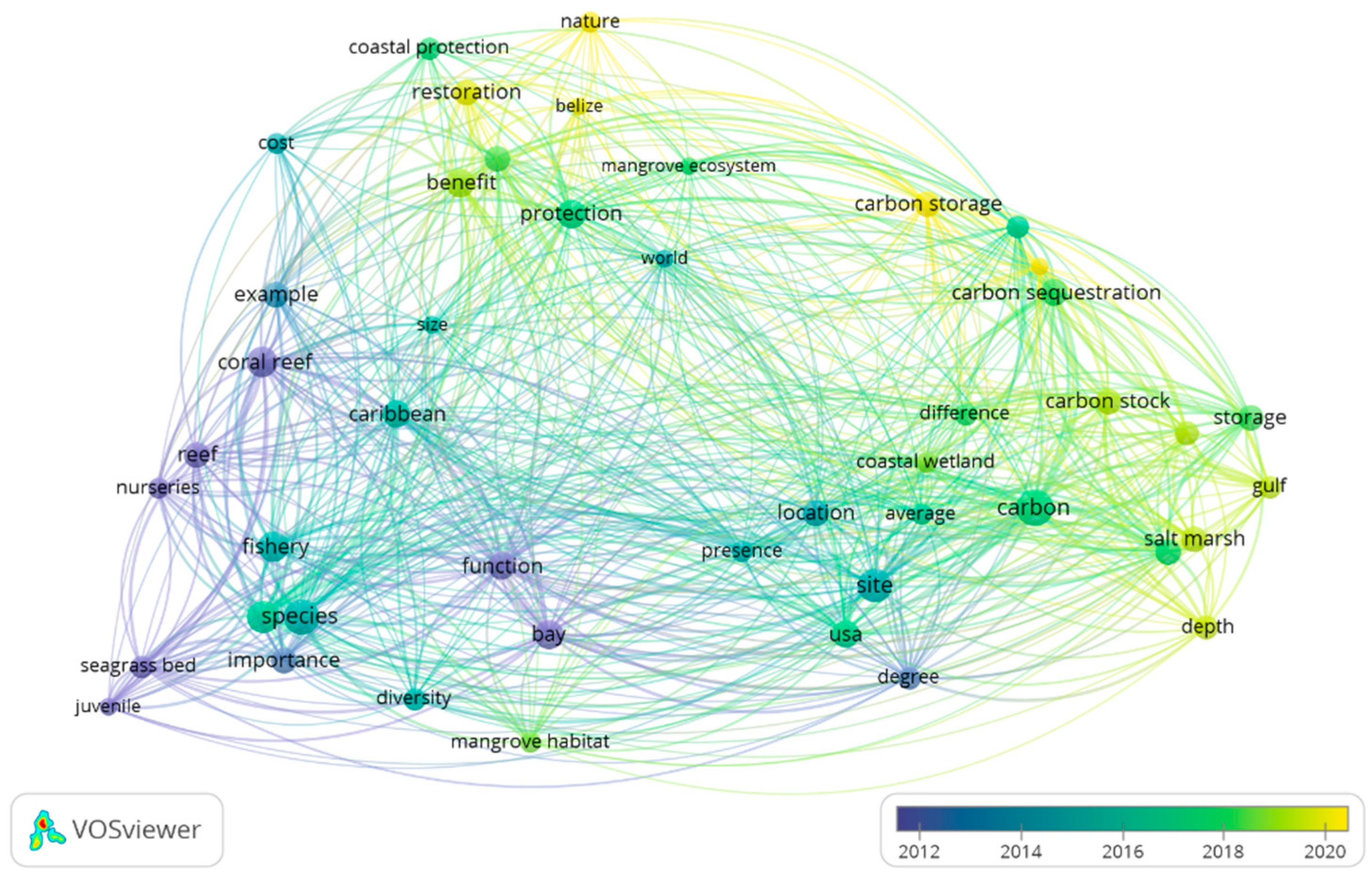 | Seagrass bed | Connectivity and Nurseries | ~2012–2014 (Blue) | Indicates research linking mangroves with adjacent ecosystems (e.g., seagrass and coral reefs). |