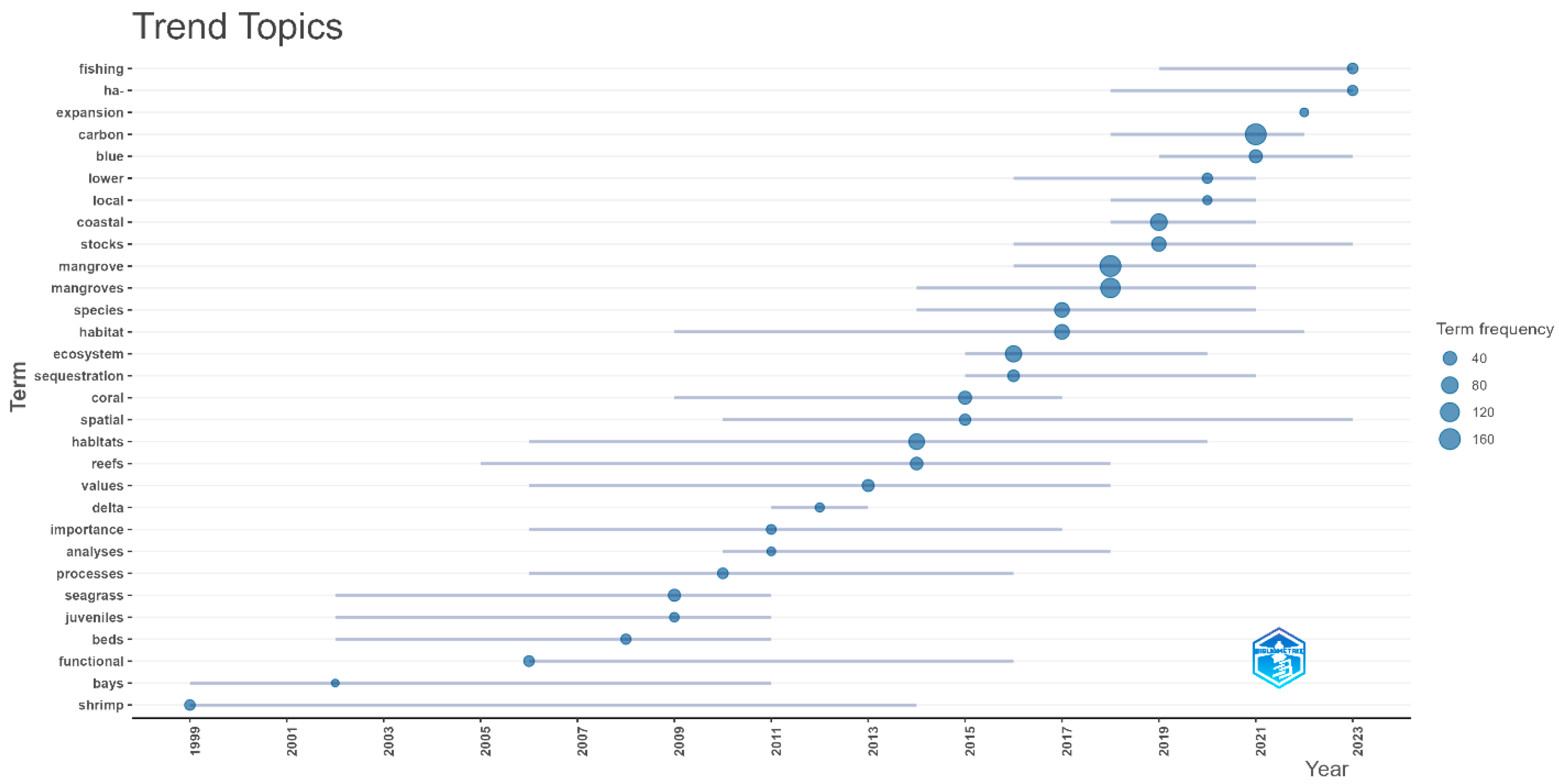 | Carbon sequestration | Blue Carbon and Climate | ~2018–2020 (Yellow) | Marks growing attention to mangrove roles in climate mitigation and carbon accounting. |