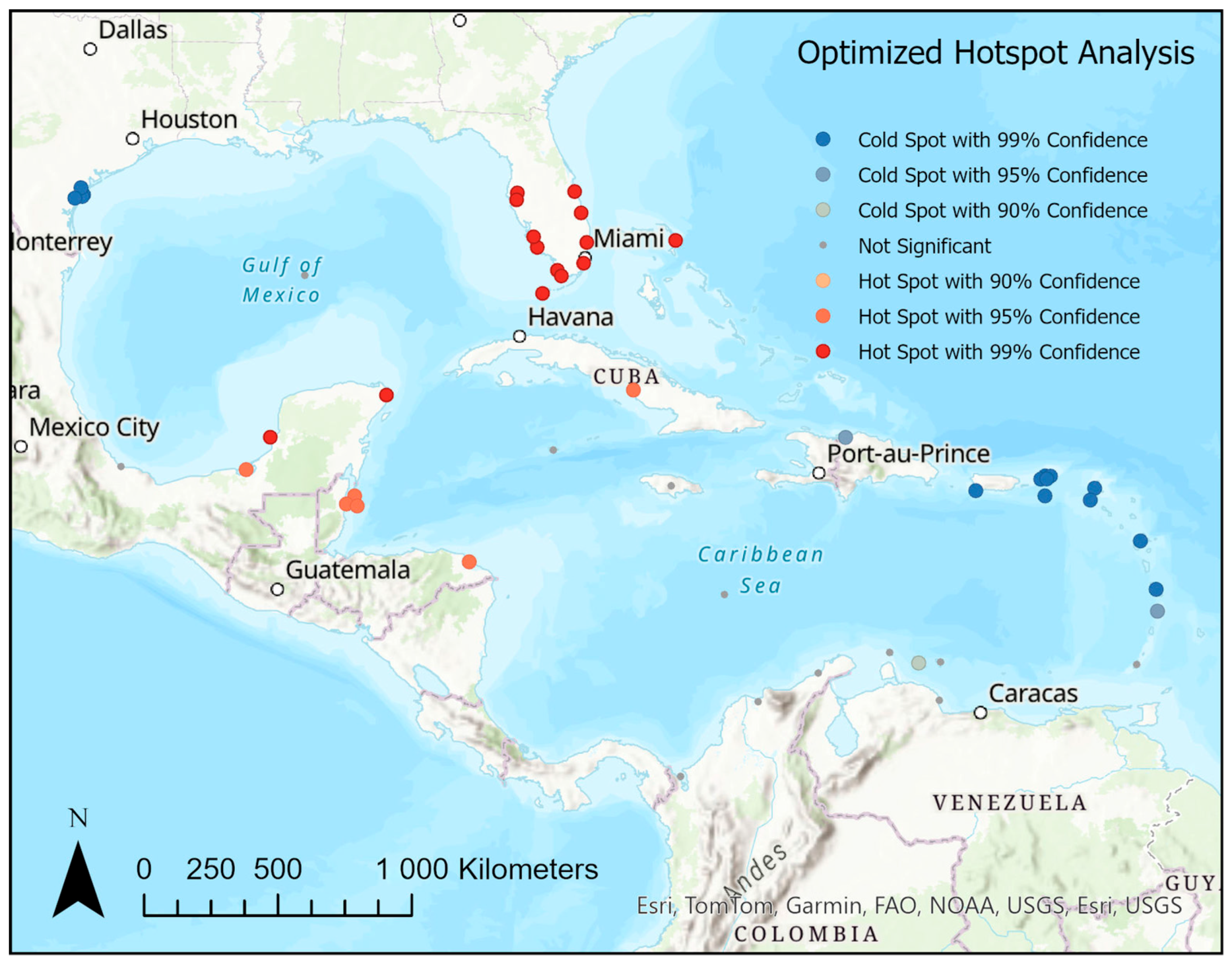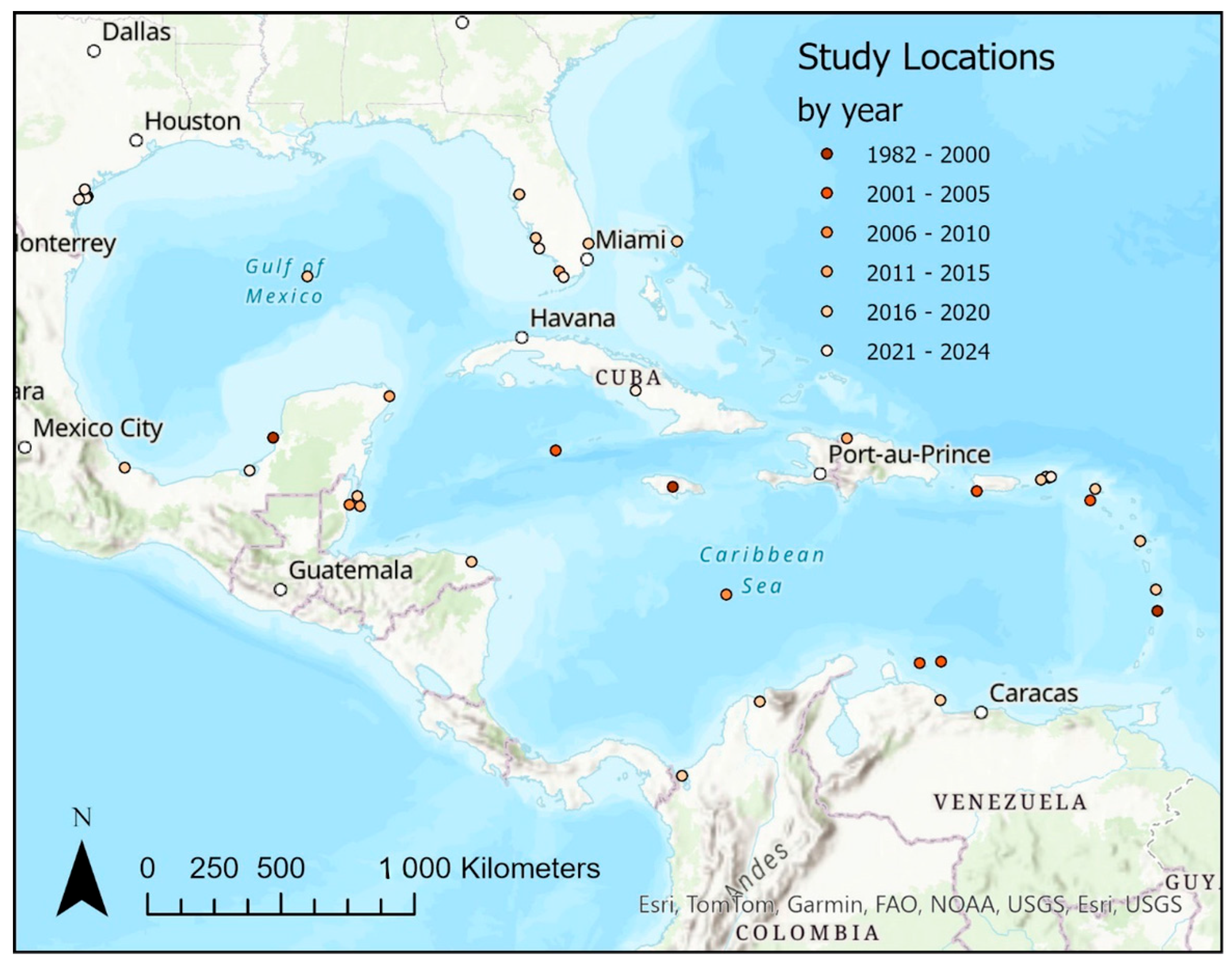 | Gulf/Belize/Caribbean | Geographic Focus | ~2014–2020 (Green to Yellow) | Identifies regional case study concentration in tropical and subtropical coastal systems. |