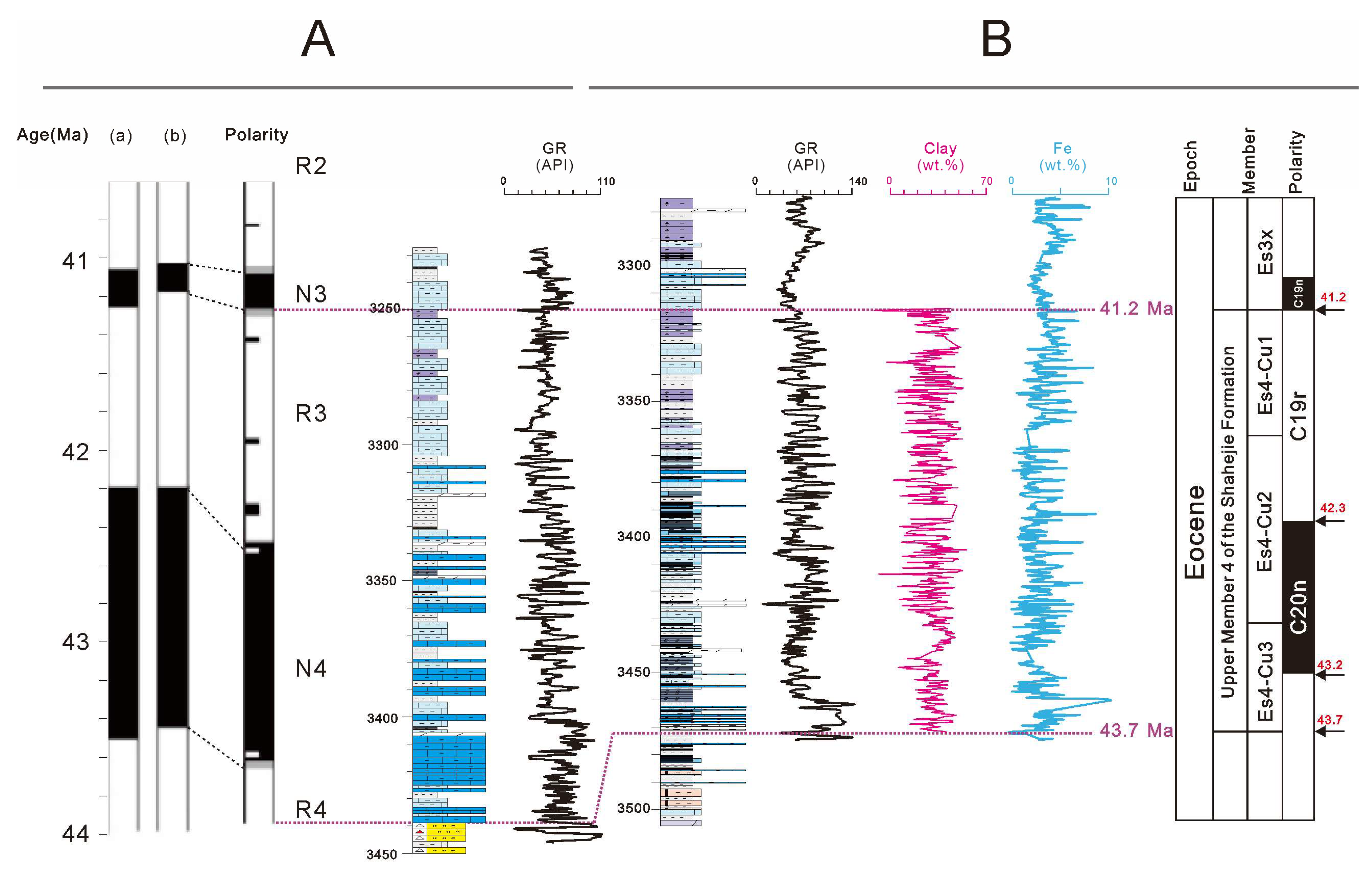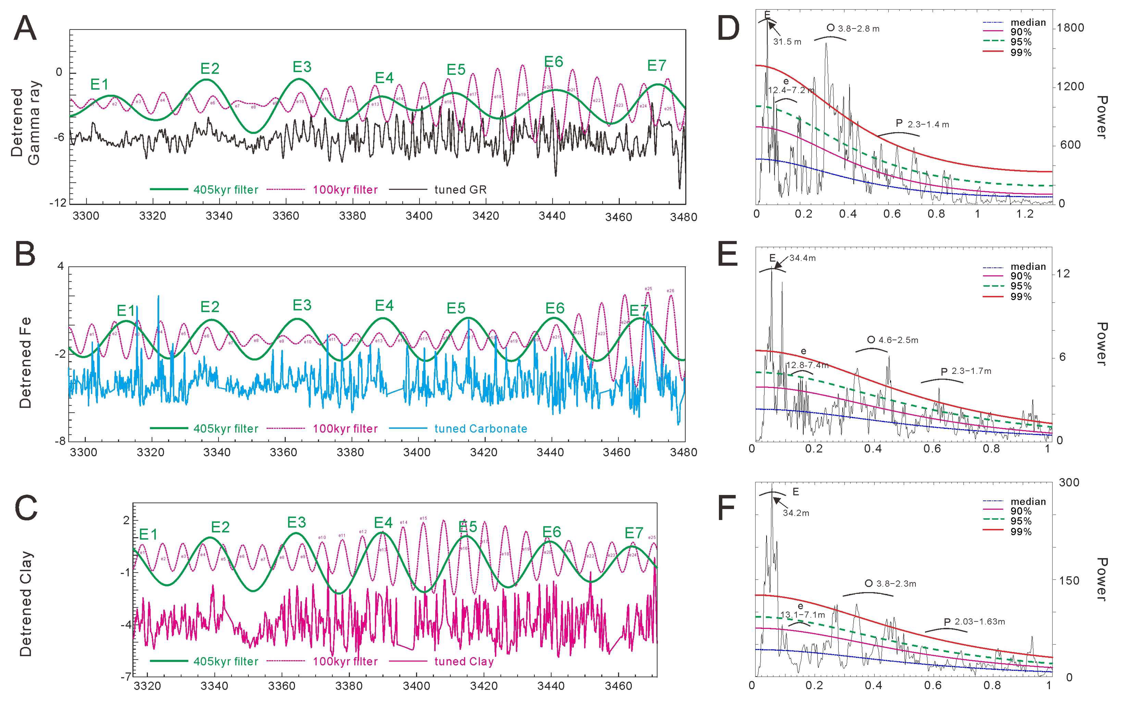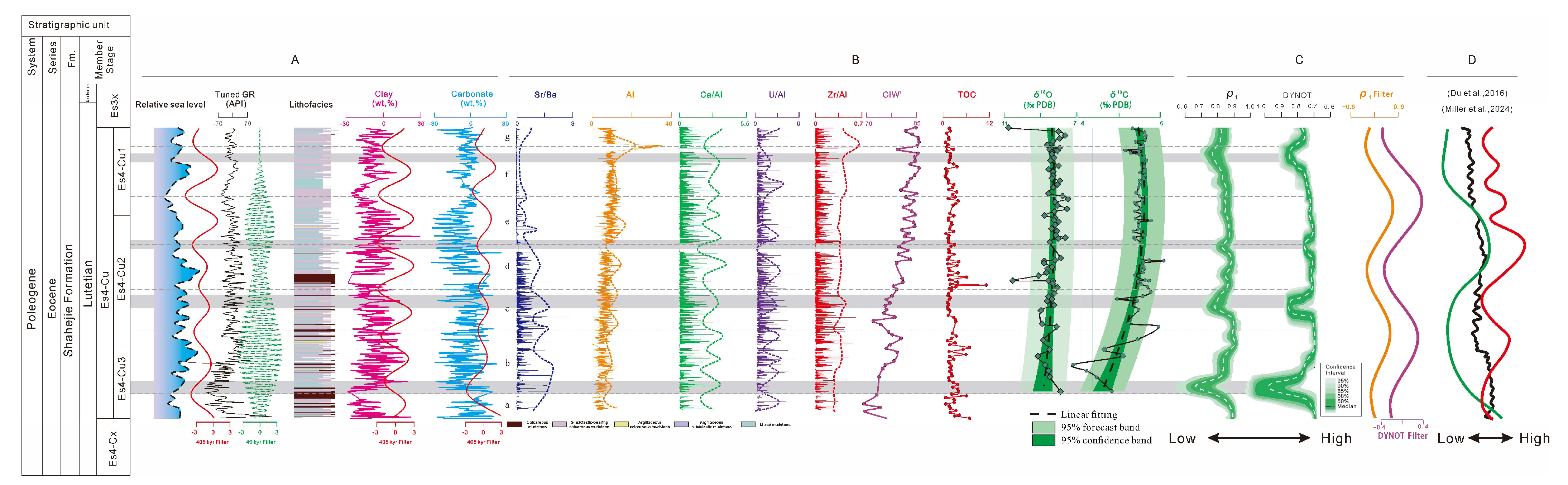 - From a sedimentological and paleoenvironmental perspective, cyclostratigraphic frameworks based on the patterns and amplitudes of GR logs, mineral abundances, elemental concentrations, and diagnostic elemental ratios—astronomically tuned to the ~405 kyr, ~100 kyr, and ~40 kyr bands—provide robust chronological constraints for the mid-late Eocene lithostratigraphic succession.