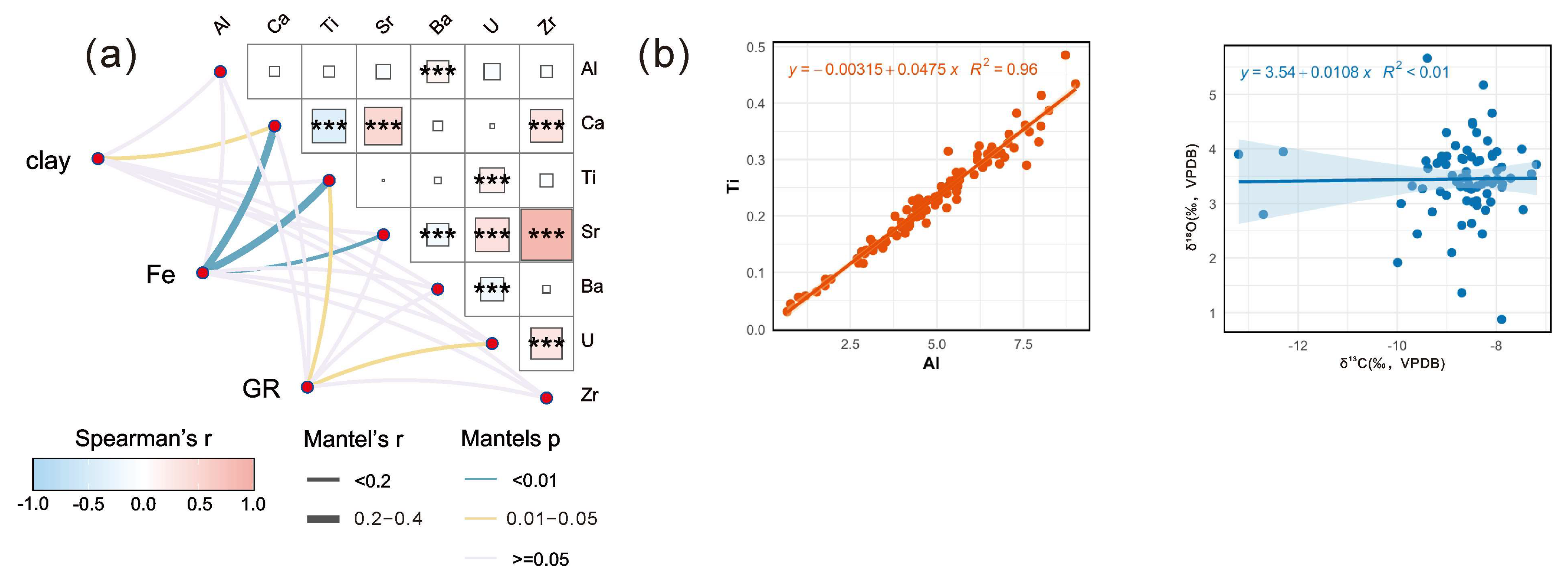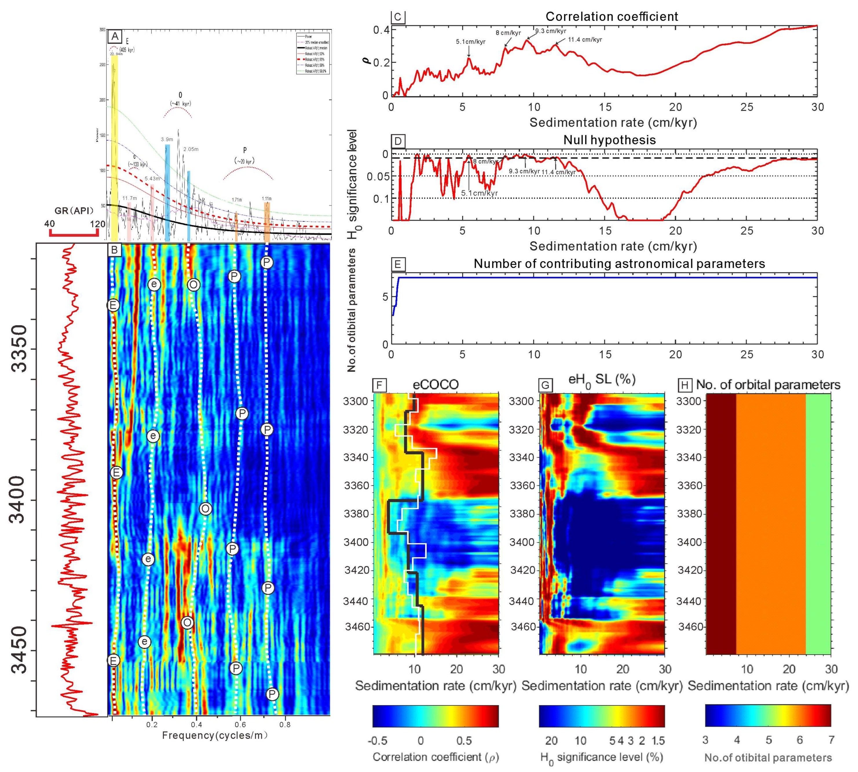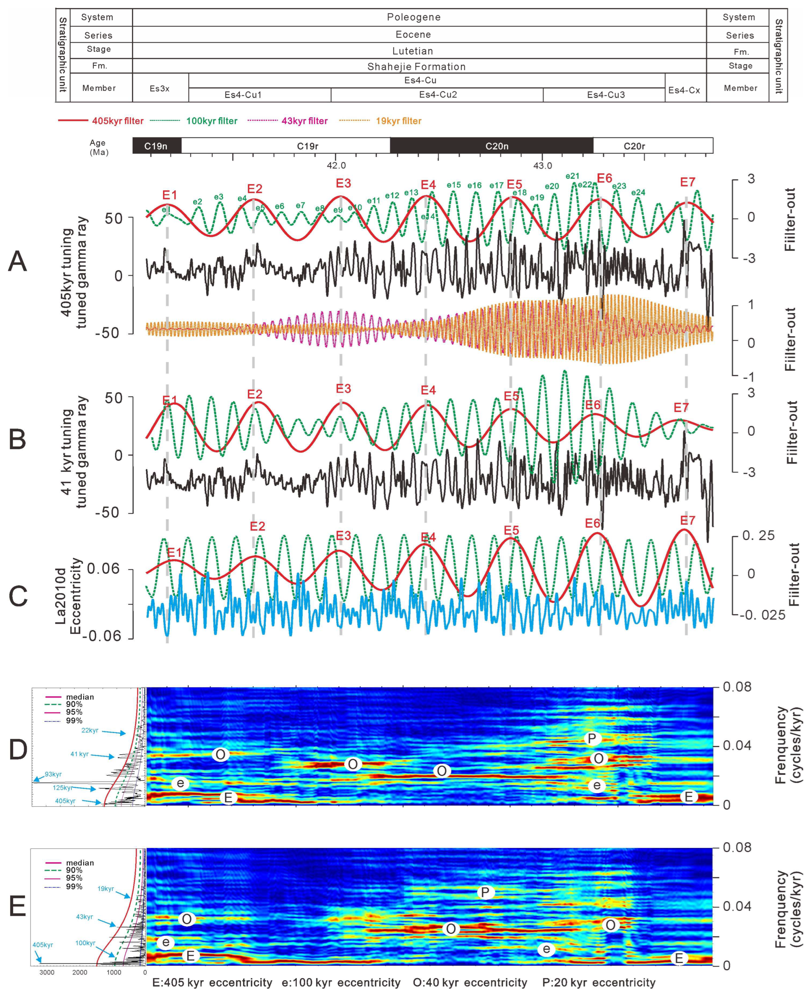 - From a sedimentological and paleoenvironmental perspective, cyclostratigraphic frameworks based on the patterns and amplitudes of GR logs, mineral abundances, elemental concentrations, and diagnostic elemental ratios—astronomically tuned to the ~405 kyr, ~100 kyr, and ~40 kyr bands—provide robust chronological constraints for the mid-late Eocene lithostratigraphic succession.