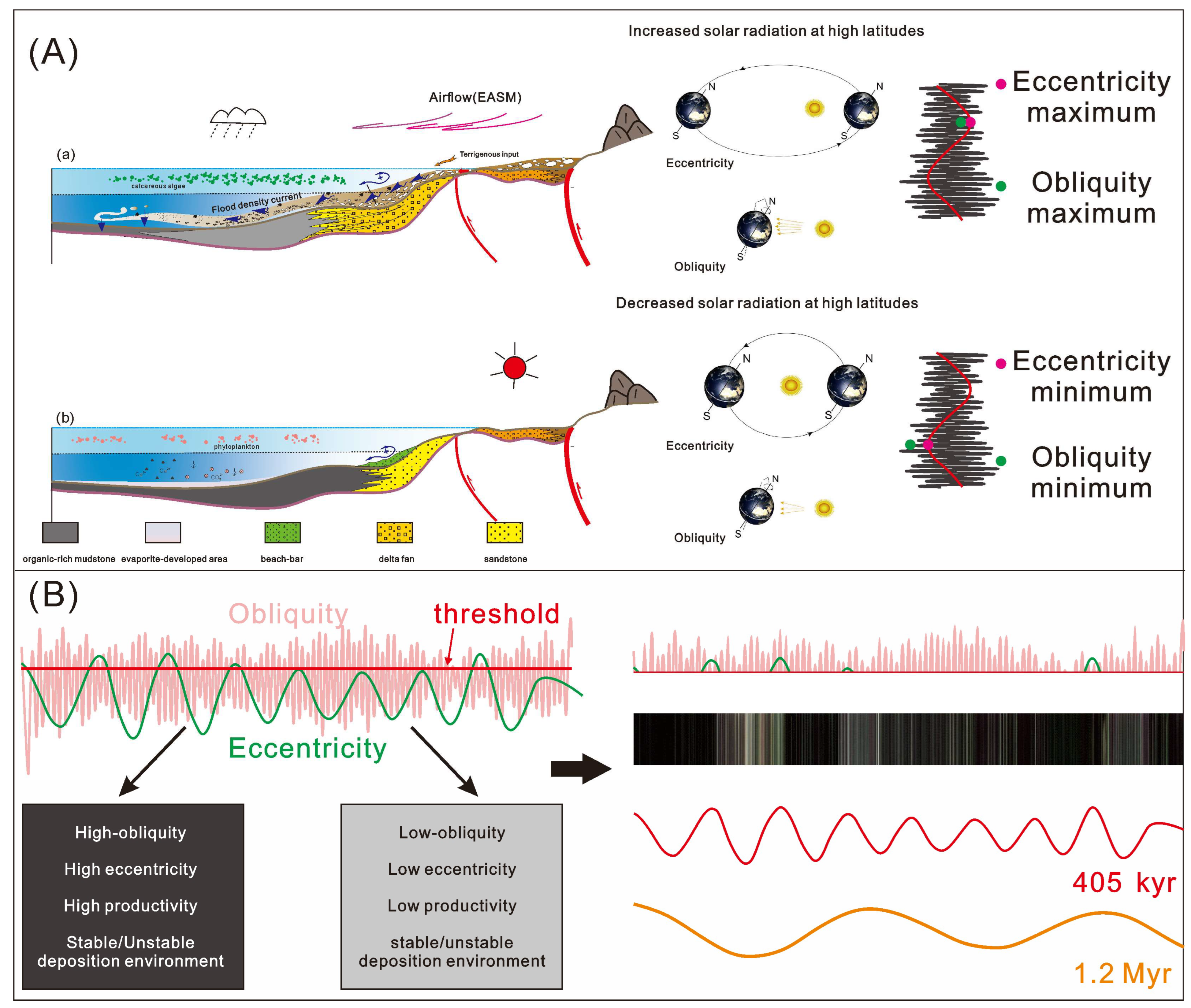 - Regional climate variability during the mid-late Eocene is governed by forcing associated with eccentricity and obliquity. Warm and humid conditions preferentially occur during intervals of coupled high eccentricity and high obliquity. Obliquity-driven forcing modulates East Asian hydroclimate cyclicity by regulating the intensity of the East Asian summer monsoon, potentially promoting a northward migration of the ITCZ. A reinforced cross-equatorial insolation gradient and pressure contrast facilitate moisture transport into the Northern Hemisphere during boreal summer. High-latitude ice sheets may further exert feedback effects within the climate system. Moreover, the superposition of orbital bands likely induces hydroclimate oscillations through nonlinear climate responses, which, in turn, drives differentiated sedimentary processes.