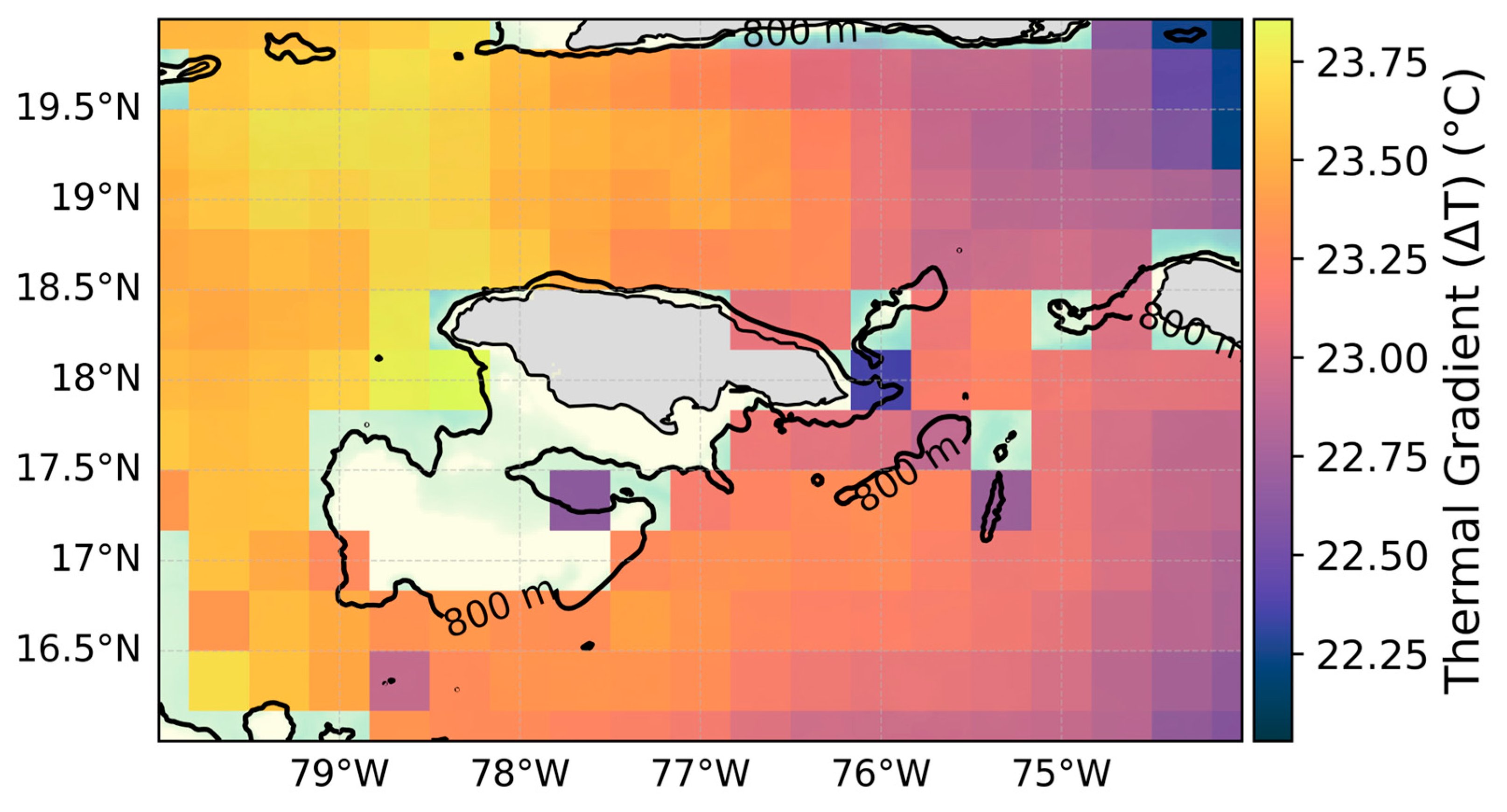 35]. The results demonstrate that Jamaica possesses a strong and spatially stable thermal resource, with annual mean thermal gradients exceeding the 20 °C threshold required for closed-cycle OTEC operation across the entire exclusive economic zone.