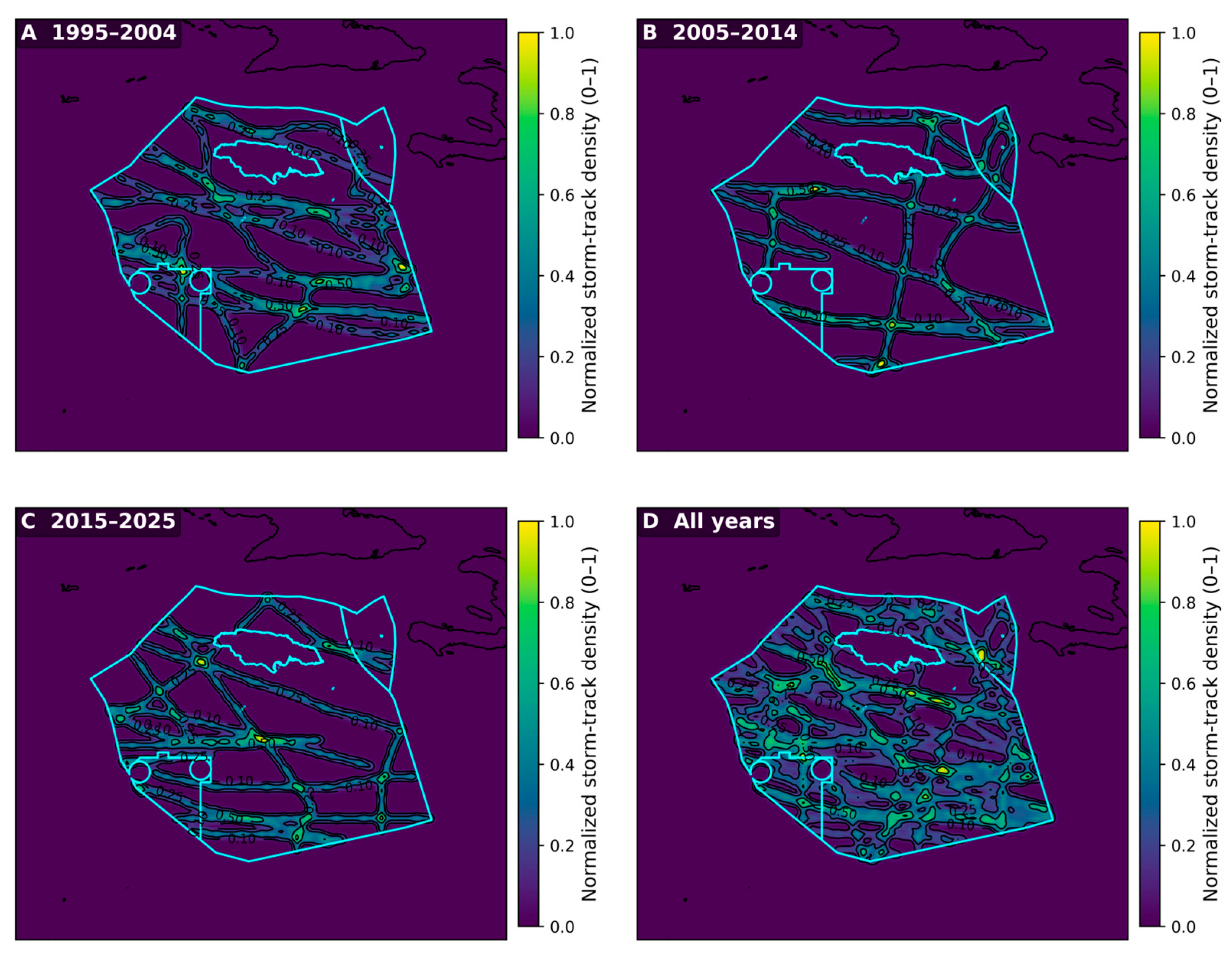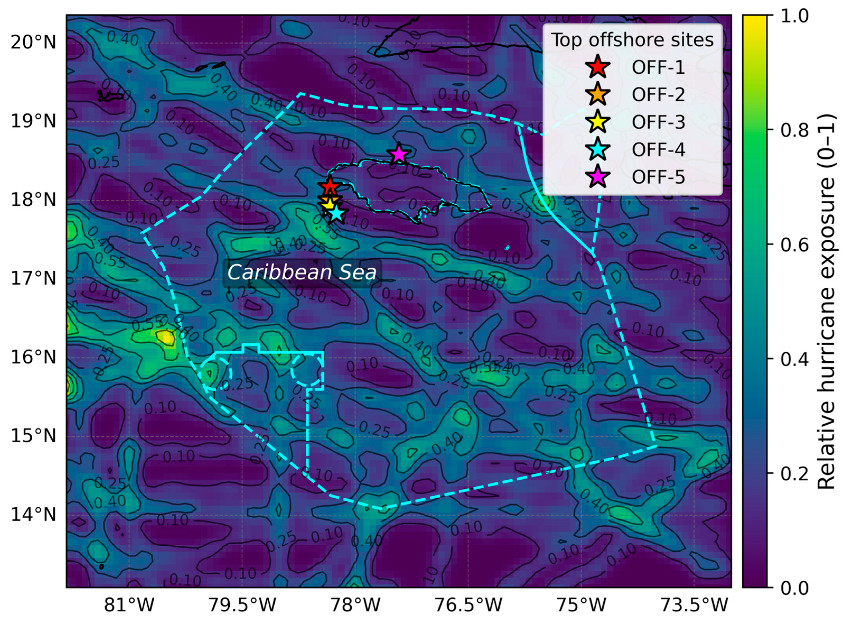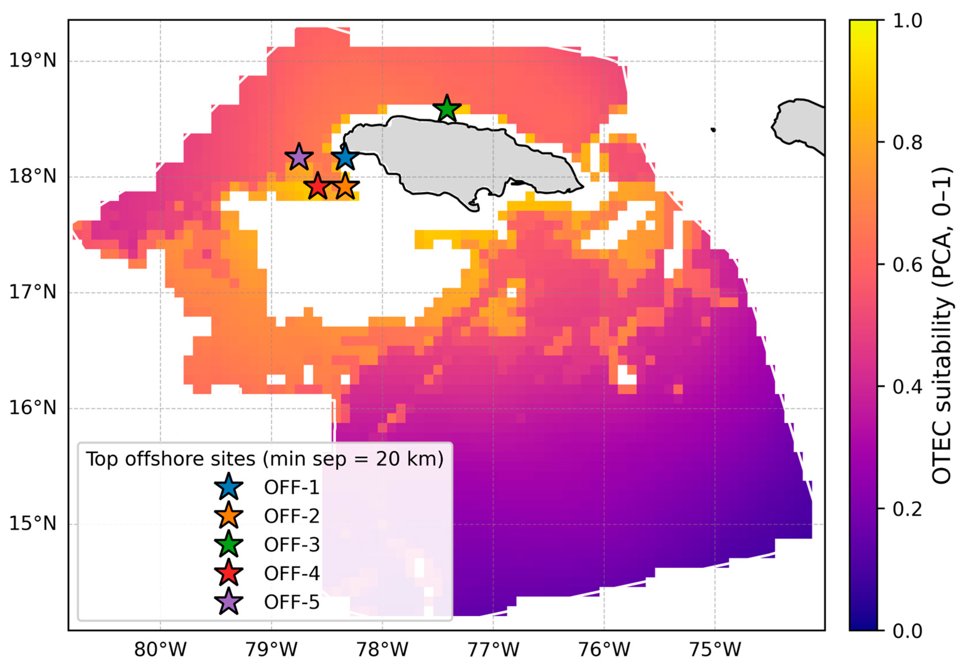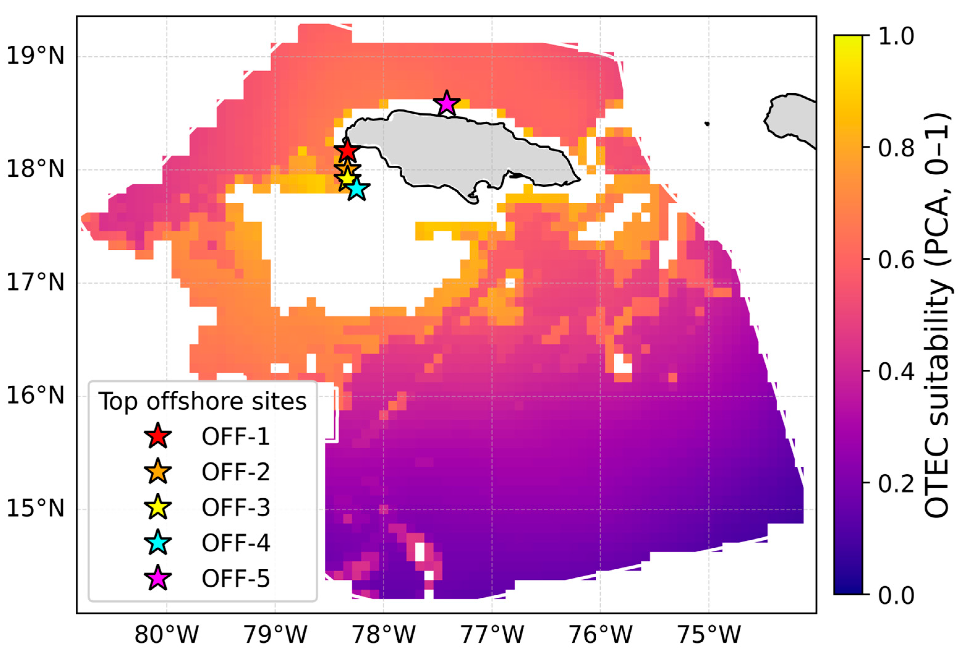 Hurricane exposure analysis reveals spatially heterogeneous patterns across Jamaica’s EEZ, with top-ranked offshore sites exhibiting moderate exposure levels (0.13–0.39 normalized scale). Sites OFF-1 (0.33) and OFF-5 (0.27) show slightly higher historical storm densities than OFF-2, OFF-3, and OFF-4 (0.13). However, these moderate exposure values do not preclude OTEC development but rather inform engineering design specifications. Contemporary OTEC engineering incorporates multiple resilience strategies specifically designed for tropical cyclone conditions, including cold-water pipe disconnection systems, platform submersion capabilities (for floating designs), reinforced mooring systems engineered for Category 4–5 conditions, and operational protocols for storm preparation. These design adaptations have been demonstrated in typhoon-prone Pacific regions and are considered standard practices for OTEC in tropical environments. The spatial heterogeneity in hurricane exposure provides flexibility for risk-informed site selection. While northwestern sites rank highest in composite suitability due to superior depth (bathymetry) and infrastructure access, the variation in storm exposure across sites allows for engineering design customization based on site-specific risk profiles.