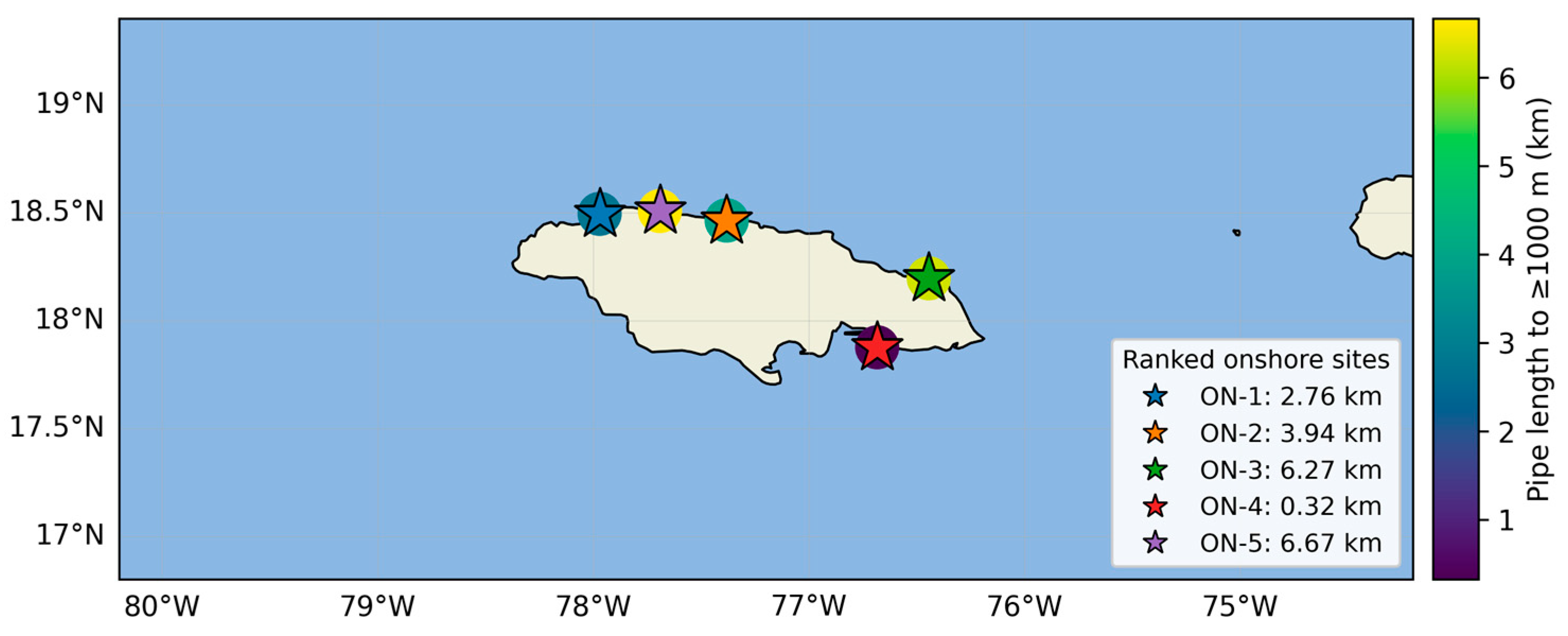 Following the initial screening, a limited number of coastal locations satisfied the maximum allowable pipe length criterion, primarily along the northern coast of Jamaica. These regions benefit from the nearness of steep bathymetric gradients to the shoreline, enabling comparatively short intake pipelines.