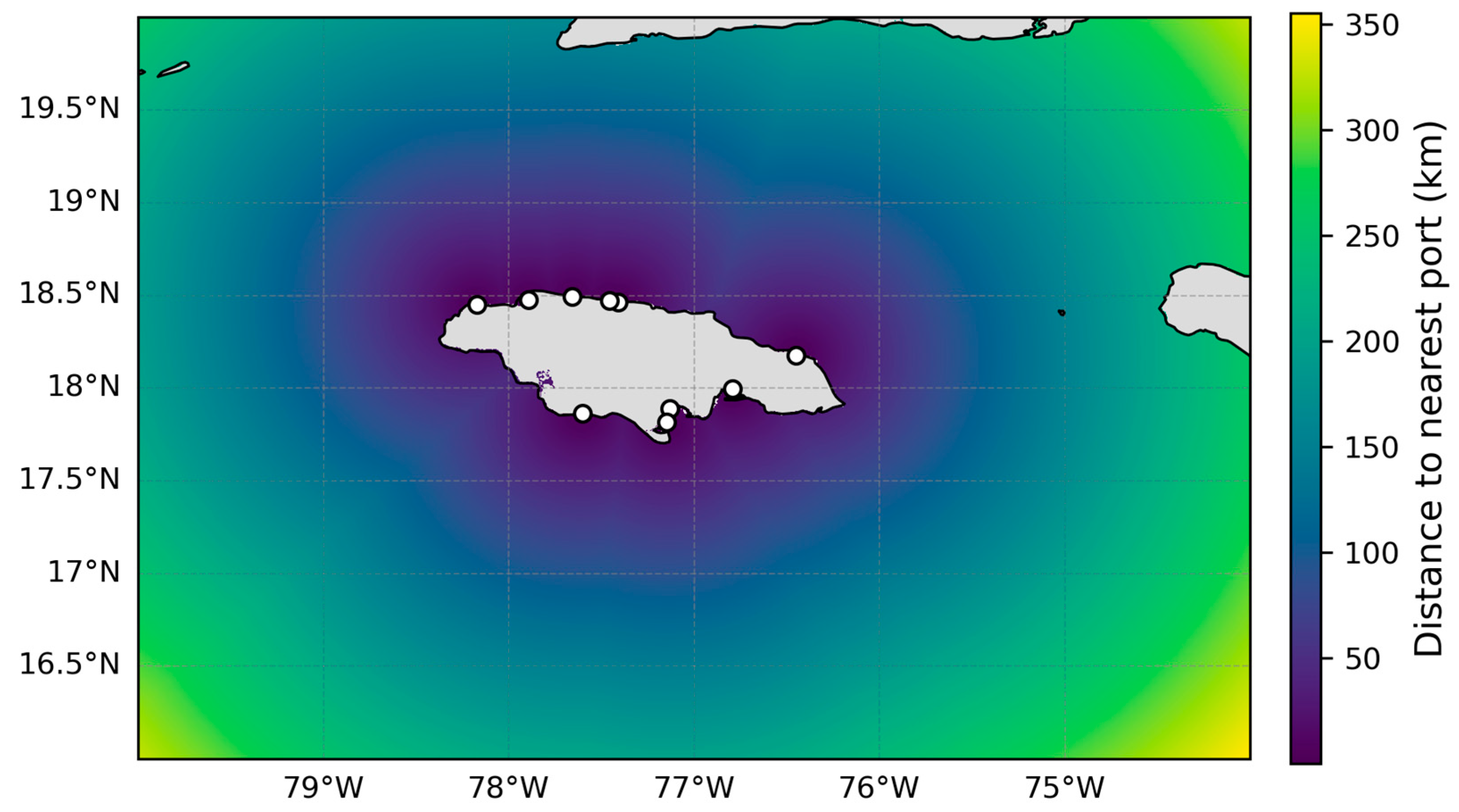 Locations of major ports and electrical substations across Jamaica were compiled from multiple sources and manually digitized. Port locations were obtained from the Port Authority of Jamaica [
